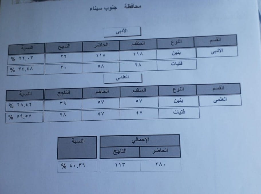 وقال الشيخ سعيد أحمد خضر، رئيس الإدارة المركزية لمنطقة جنوب سيناء الأزهرية، إنه جرى اعلان النتيجة عقب اعتمادها من قبل الدكتور محمد الضويني، وكيل الأزهر الشريف، مشيرًا إلى أنه تقدم لامتحانات الشهادة الثانوية في شعبتي الأدبي والعلمي 280 طالبًا وطالبة، وبلغت نسبة النجاح 40،36 %، بواقع 118 طالبً وتقدم في شعبة الأدبي نجح منهم 26، وبلغت نسبة النجاح 22،03%، و58 طالبة، نجحت منهم 20 فقط بنسبة 34،48%.