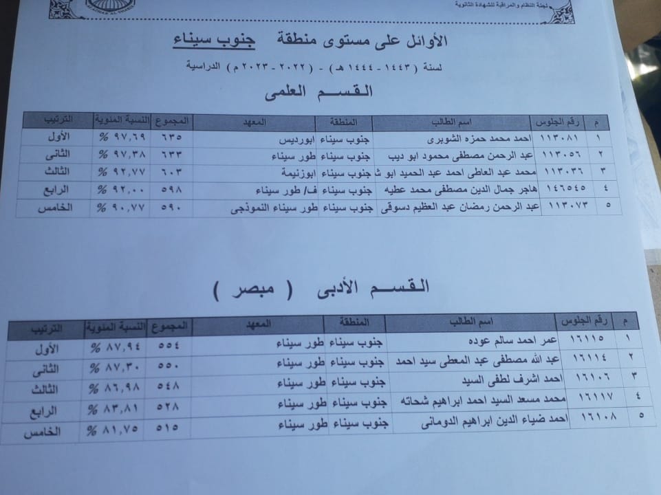 وفي القسم الأدبي مبصرين، حصل الطالب عمر أحمد سالم عودة، معهد طور سيناء على مجموع 554 درجة بنسبة نجاح 87,94%، بينما حصل الطالب عبد الله مصطفى عبد المعطي سيد أحمد، معهد طور سيناء على مجموع 550 درجة، بنسبة نجاح 87,30%.