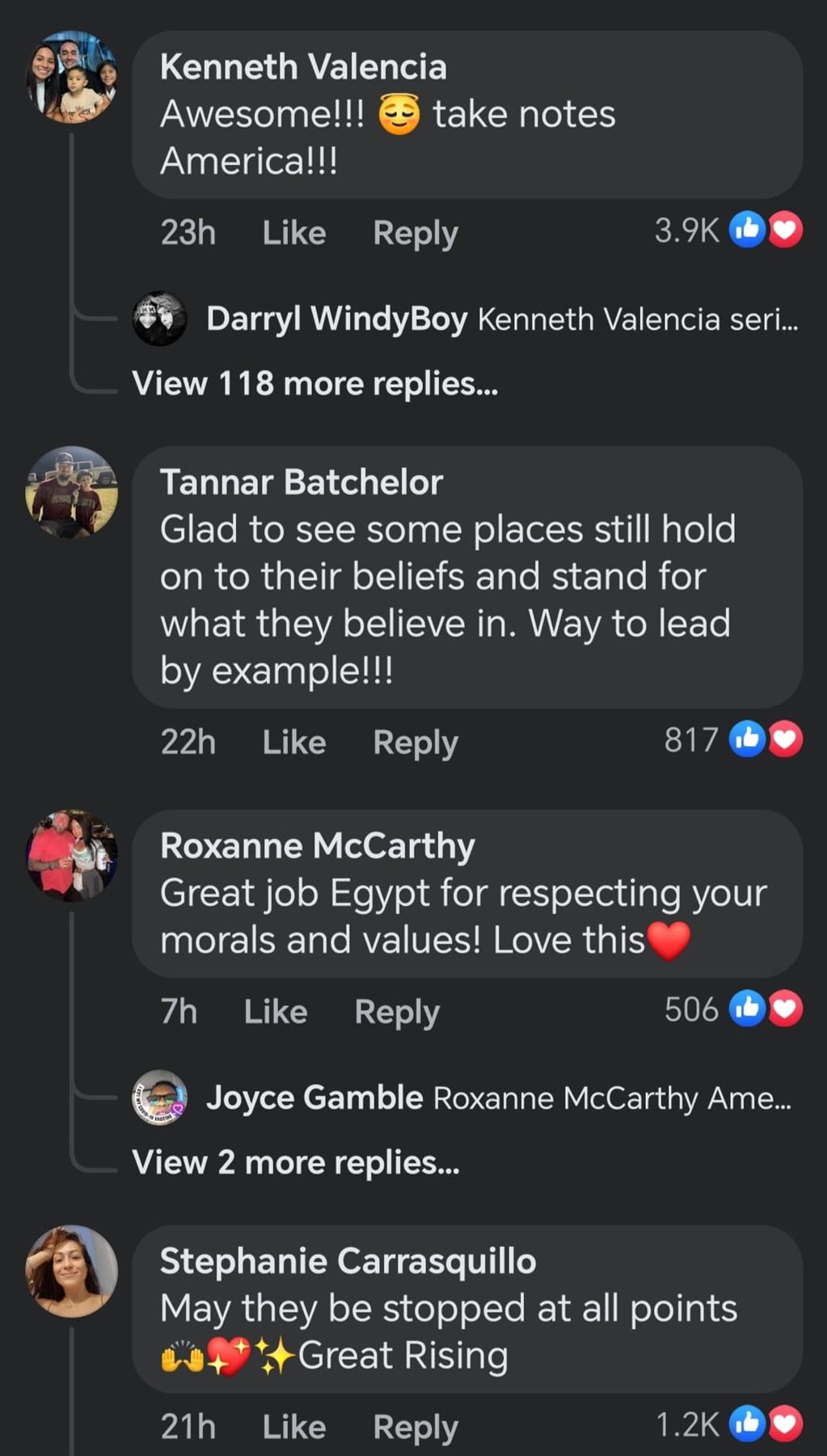 وسرعان ما انهالت تعليقات الأجانب الإيجابية بعد إعلان قرار الإلغاء بشكل رسمي والتي جاءت كالآتي، "رائع سجلي ملاحظات يا أمريكيا"، من الجيد أن يبقى هناك دولة تحافظ على قيمها ومبادئها وقواعدها، عاشت مصر تعلمي يا أمريكا"، "عمل رائع يا مصر من الجدل رؤية بلد ما زالت محافظة على الأخلاق والقيم"، "أحيي مصر على هذا القرار الصائب".