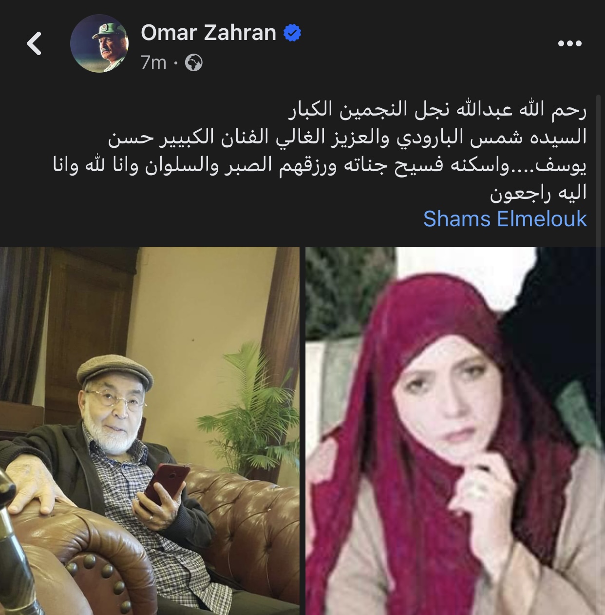 وكتب “زهران” عبر حسابه الشخصي بموقع التواصل الاجتماعي “فيسبوك”: "رحم الله عبدالله نجل النجمين الكبار السيدة شمس البارودي والعزيز الغالي الفنان الكبير حسن يوسف، وأسكنه فسيح جناته ورزقهم الصبر والسلوان وإنا لله وإنا إليه راجعون".