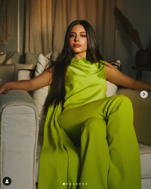 وبدت مايان السيد بإطلالة باللون الأخضر، فضمت بنطال ذا ساقين فضفاضتين وبصيحت الهاي ويست، ونسقت عليه بلوزة كت من قماش الحرير، ومُزينة بوشاح ملتف حول الرقبة ويتدلى على أحد الكتفين؛ ليعطي لمسه أنيقة وجذابة.