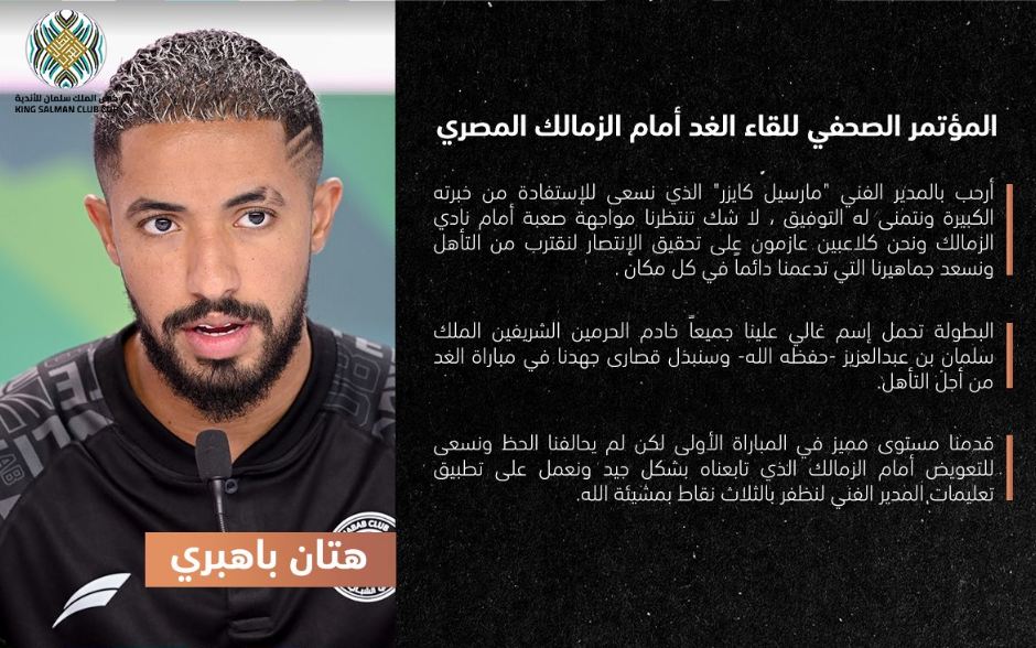 تحدث النجم السعودي الدولي هتان باهبري لاعب فريق نادي الشباب السعودي، عن مواجهة الزمالك في الجولة الثانية من منافسات البطولة العربية للأندية، والتي ستكون جنبًا لجنب بالنسبة لمواجهة محمود عبدالرازق شيكابالا قائد الفارس الأبيض.