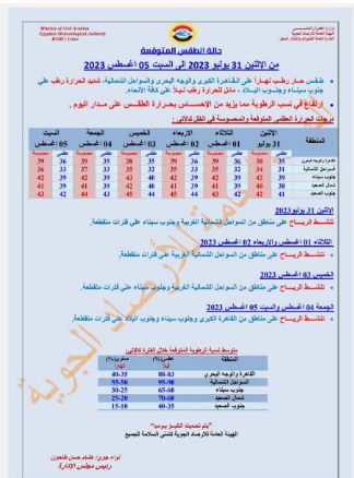 أعلنت الهيئة العامة للأرصاد الجوية بيانًا تفصيليًا عن حالة الطقس من الإثنين 31 يوليو 2023 إلى الثلاثاء 5 أغسطس.