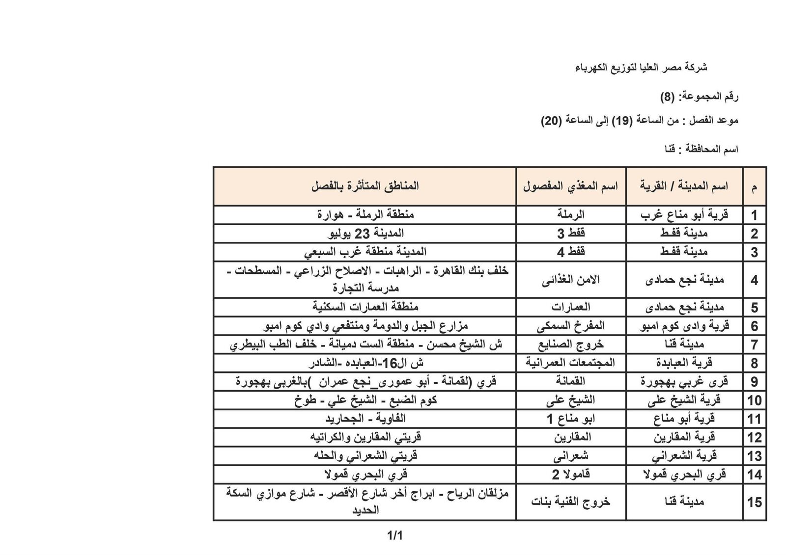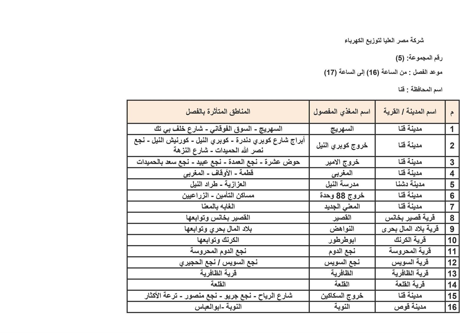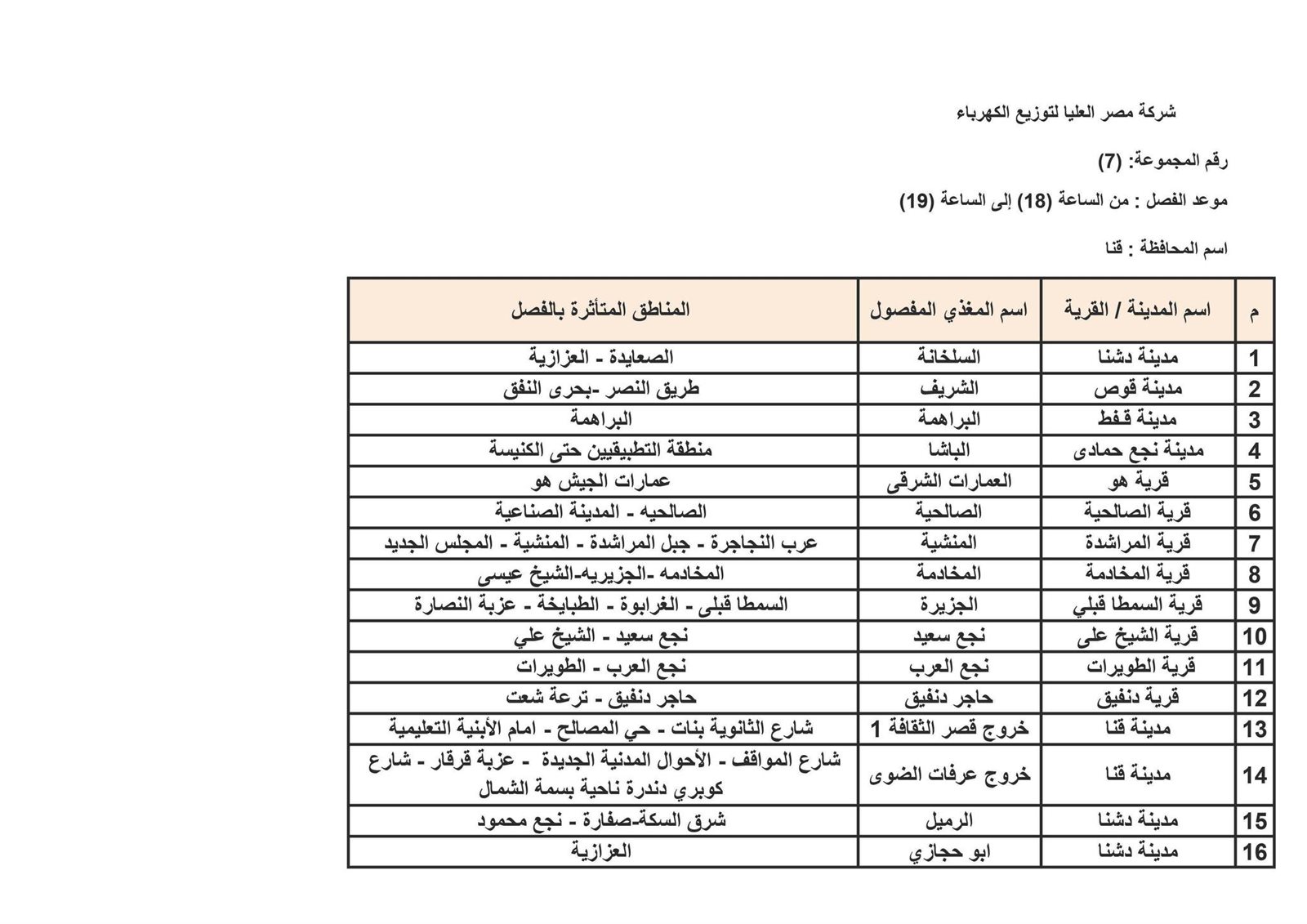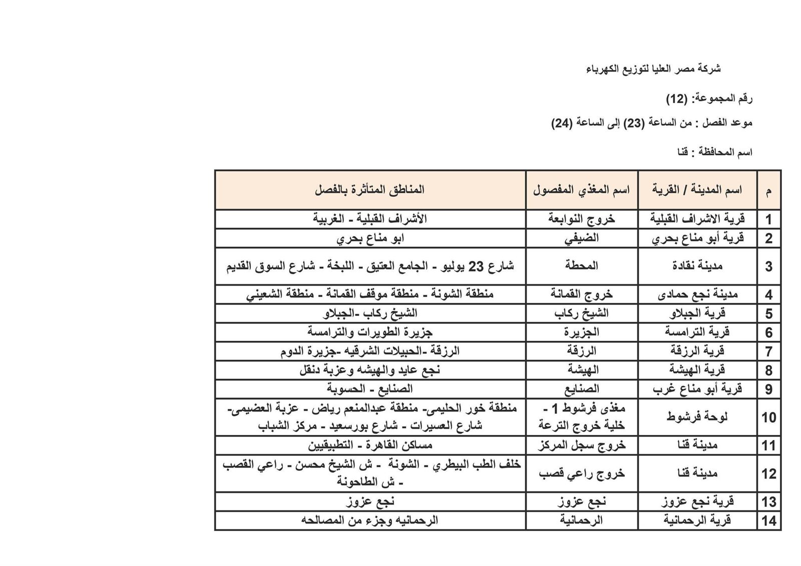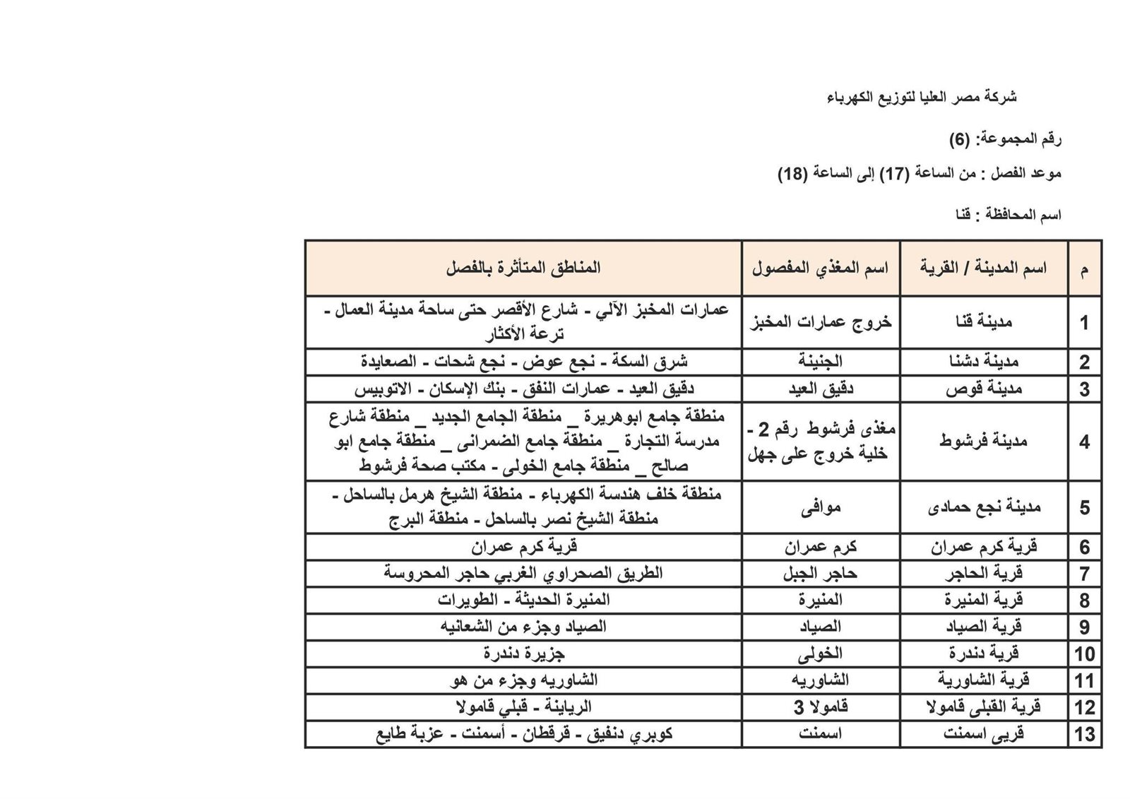 وتم تقسيم جدول قطع الكهرباء بمحافظة قنا على 12 مجموعة: