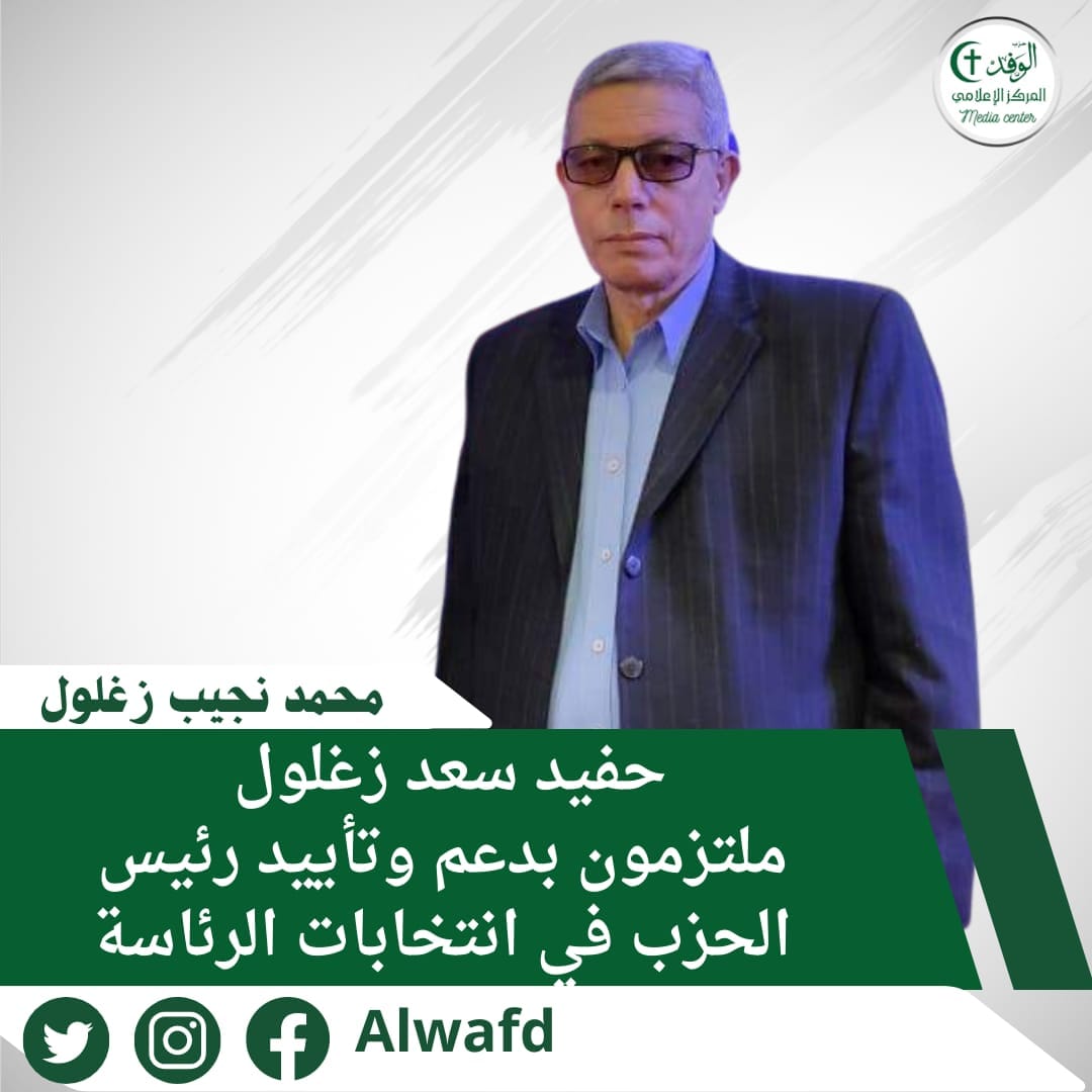 أعلن محمد نجيب زغلول حفيد زعيم الوفد المؤسس سعد باشا زغلول ورئيس اللجنة العامة للوفد بكفر الشيخ التزامه الكامل بدعم وتأييد الدكتور عبدالسند يمامة رئيس الوفد كمرشح لحزب الوفد في انتخابات الرئاسة.