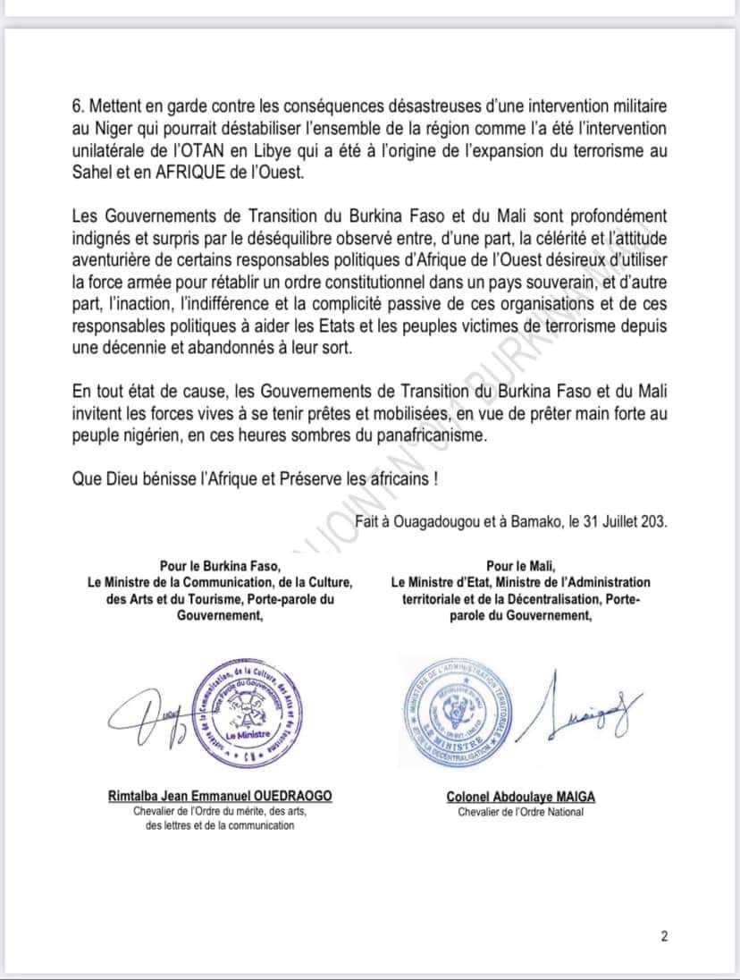 5 - نحذر من أن أي تدخل عسكري ضد النيجر سيؤدي إلى انسحاب بوركينا فاسو ومالي من الجماعة الاقتصادية لدول غرب أفريقيا ، فضلا عن اتخاذ تدابير للدفاع عن النفس دعما للقوات المسلحة وشعب النيجر ؛