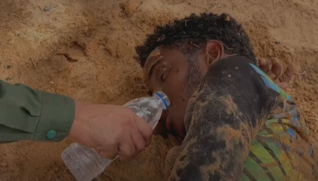 فعند الظهيرة تفوق الحرارة 40 درجة مئوية، عثرت دورية ليبية على مهاجر أفريقي، مغمًا عليه، وحاول أفرادها إنعاشه، عبر سكب بعض قطرات من الماء على شفتيه، وبالكد كان يتنفس.