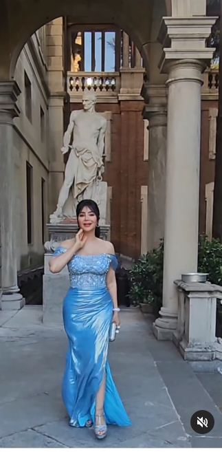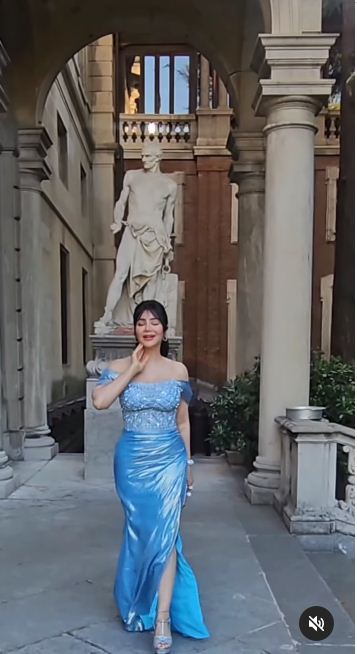 وظهرت لجين عمران بإطلالة ساحرة، حيث ارتدت فستانا طويلا مجسما، ينتمى لقصة الكب، ينتمى لشق مثير كشف عن أحد ساقيها، صمم من قماش الساتان باللون الفيروزي وزين ببعض الكريستال من الأمام، وعكس الفستان قوامها الممشوق ووزنها المثالي.