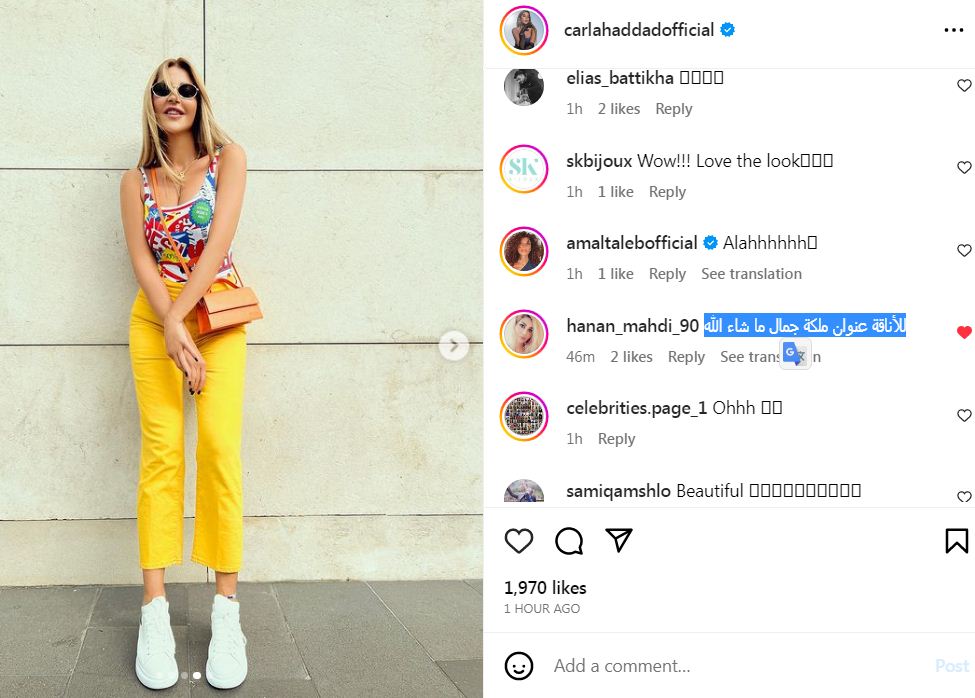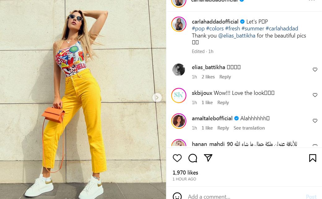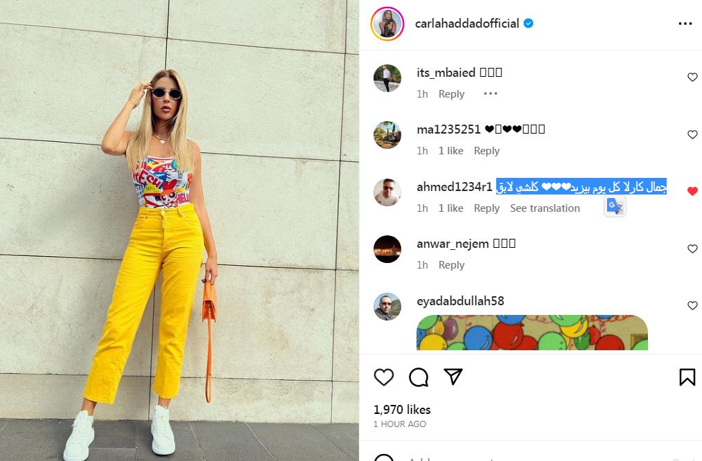 تفاعل متابعو الإعلامية اللبنانية كارلا حداد مع أحدث إطلالاتها الصيفية المنعشة التي شاركتهم إياها عبر حسابها الشخصي بموقع تبادل الفيديوهات والصور الأشهر إنستجرام، وجاءت أبرز التعليقات مؤيده لها: "جمال كارلا كل يوم بيزيد كلشي لابق، حلوه عسوله اوي، للأناقة عنوان ملكة جمال ما شاء الله".