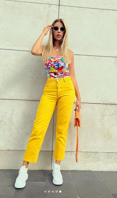 واستطاعت كارلا حداد أن تستغل ألوان الصيف المنعشة لتبرز تناسق قوامها الممشوق، حيث ارتدت مايوه مكشوف الظهر، صمم من قماش اللاميه المزركش بالألوان المبهجة مثل الأحمر في الأصفر والأبيض ونسقت معه بنطال ينتمى لصيحة الهاي ويست باللون الأصفر الزاهي فيما انتعلت حذاء مسطح باللون الأبيض.