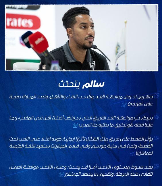 تحدث سالم الدوسري لاعب فريق نادي الهلال السعودي عن مواجهة الوداد، واللقاء الحاسم ضد الفريق المغربي في المجموعة الثالثة من البطولة العربية للأندية.