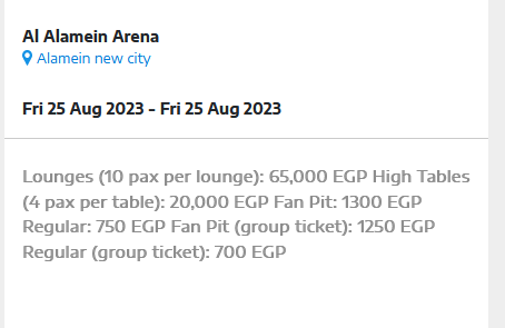وتراوحت أسعار التذاكر بين 700 - 56 ألف جنيه (بحد أدنى 10 أشخاص)، وتم طرحها عبر الموقع الاليكرتوني الخاص بها.