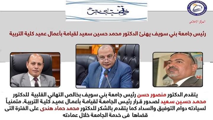 أصدر الدكتور منصور حسن رئيس جامعة بني سويف قرارًا رقم 1143 بندب الدكتور محمد حسين سعيد حسين الأستاذ بكلية التربية للقيام بأعمال عميد كلية التربية لمدة عام، ووجَّه رئيس الجامعة الشكر للدكتور حماد هندي العميد السابق على الجهد المبذول أثناء فترة توليه عمادة الكلية، وتقديرًا لجهوده وعطائه خلال سنوات العمل بالجامعة ومشاركته الفعالة في العمل على خدمة الجامعة وتطويرها.