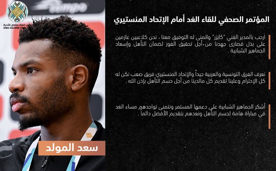 وقال سعد المولد لاعب فريق الشباب السعودي خلال المؤتمر الصحفي قبل مباراة الليوث ضد الاتحاد المنستيري: "نعرف كرة القدم التونسية والعربية جيدًا ونحترم فريق الاتحاد المنستيري وهو فريق صعب لكن هدفنا الفوز بالبطولة العربية".