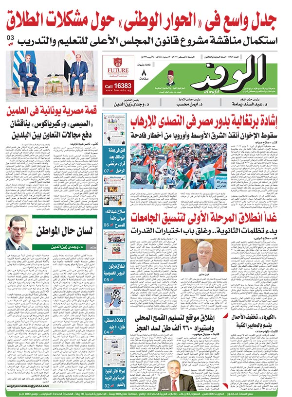 تنشر جريدة الوفد اليومية الورقية في عددها الصادر، غدًا الجمعة، الكثير من الموضوعات والتقارير الإخبارية المهمة، أبرزها: "جدل واسع في "الحوار الوطني" حول مشكلات الطلاق".
