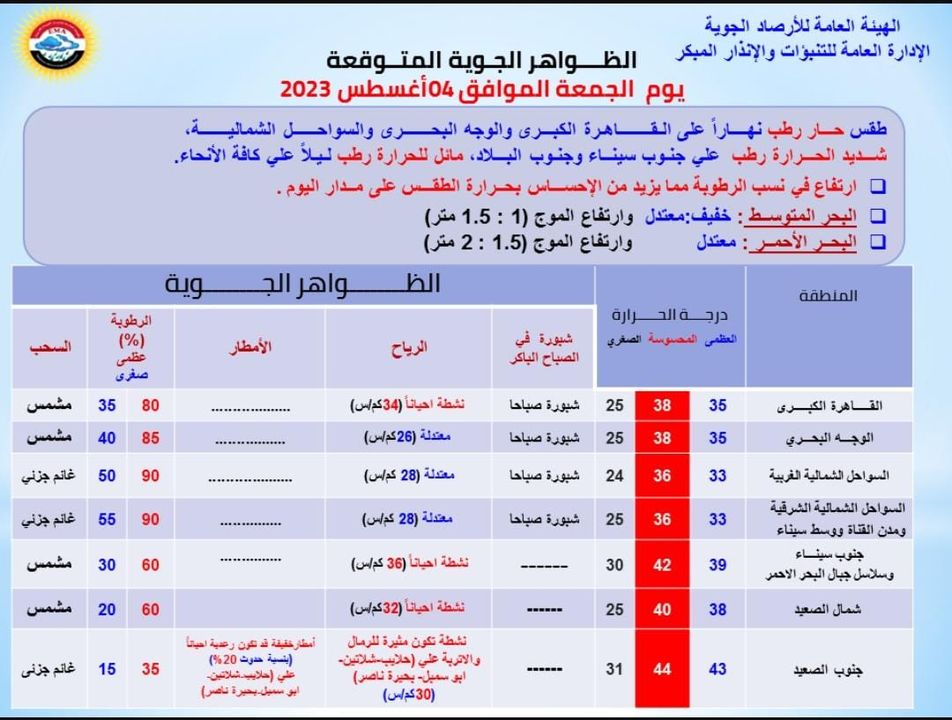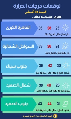 وفيما يأتي بيان بدرجات الحرارة المتوقعة، اليوم، على محافظات ومدن مصر: