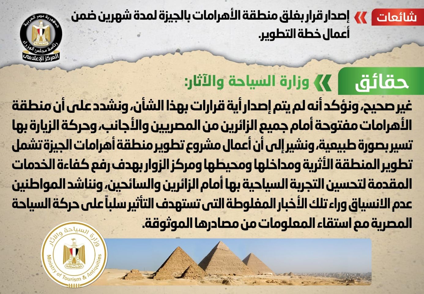 وقام المركز الإعلامي لمجلس الوزراء بالتواصل مع وزارة السياحة والآثار، والتي نفت تلك الأنباء، مُؤكدةً أنه لا صحة لغلق منطقة الأهرامات بالجيزة لمدة شهرين ضمن أعمال خطة التطوير، وأنه لم يتم إصدار أية قرارات بهذا الشأن، مُشددةً على أن منطقة الأهرامات مفتوحة أمام جميع الزائرين من المصريين والأجانب، وحركة الزيارة بها تسير بصورة طبيعية.