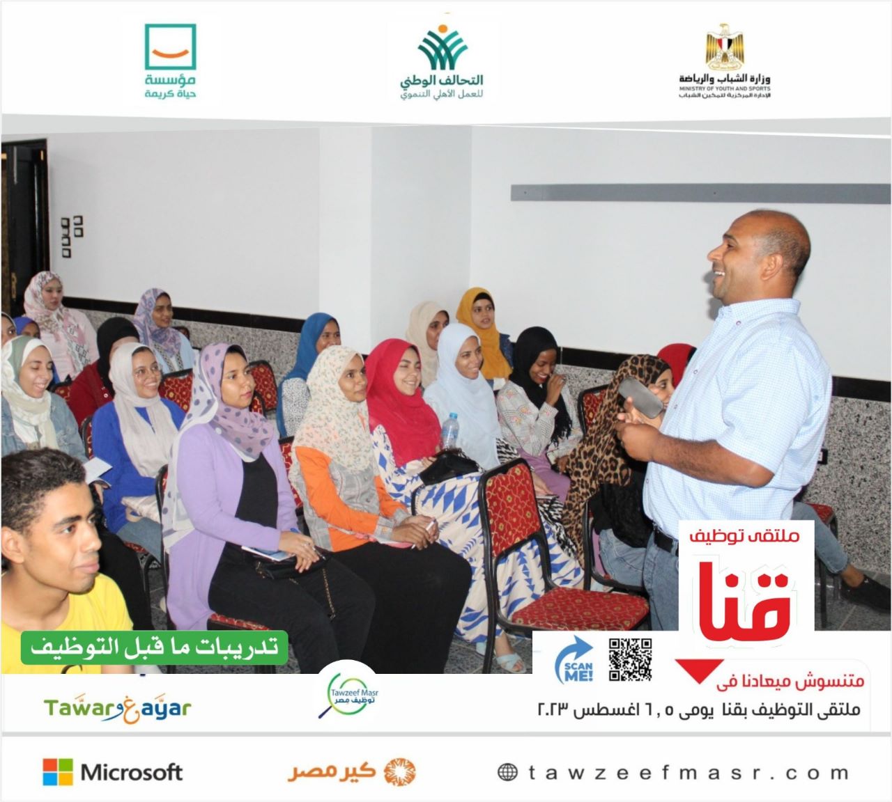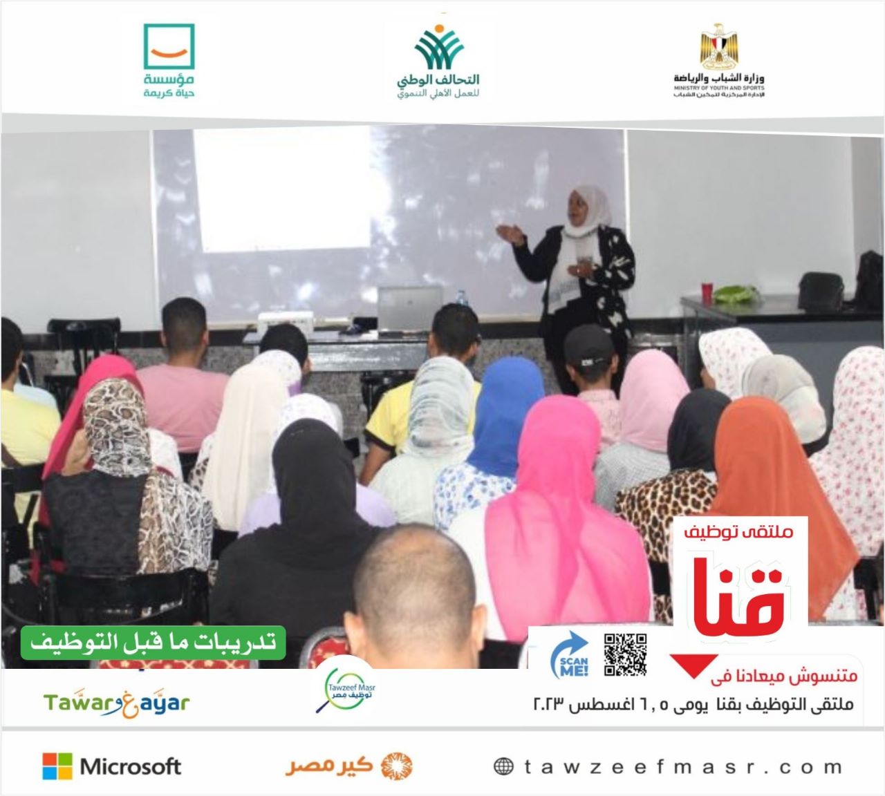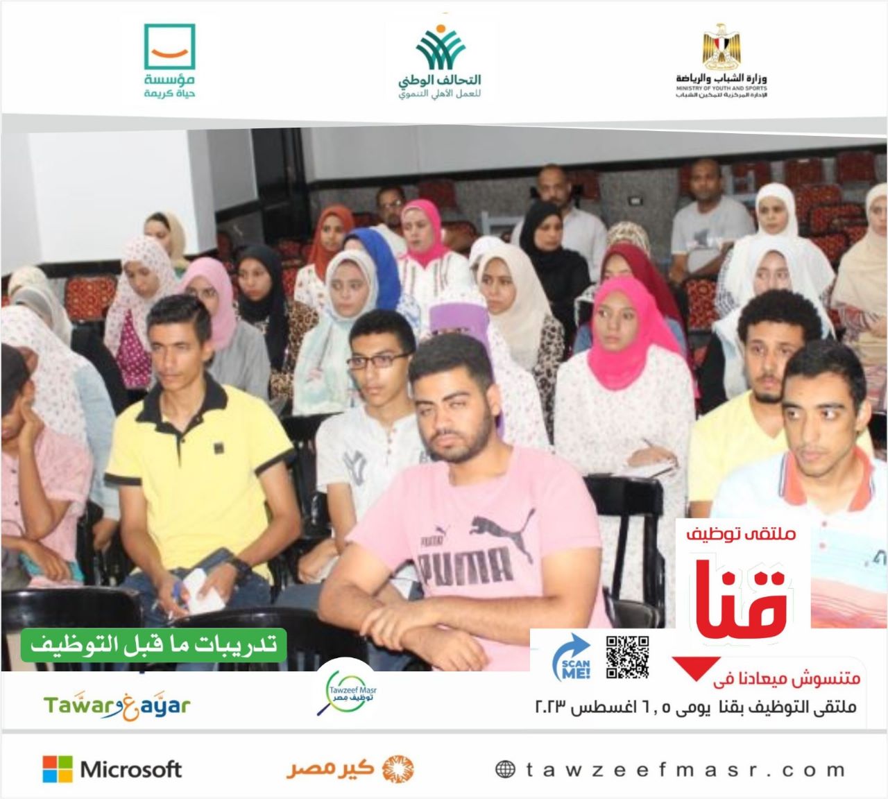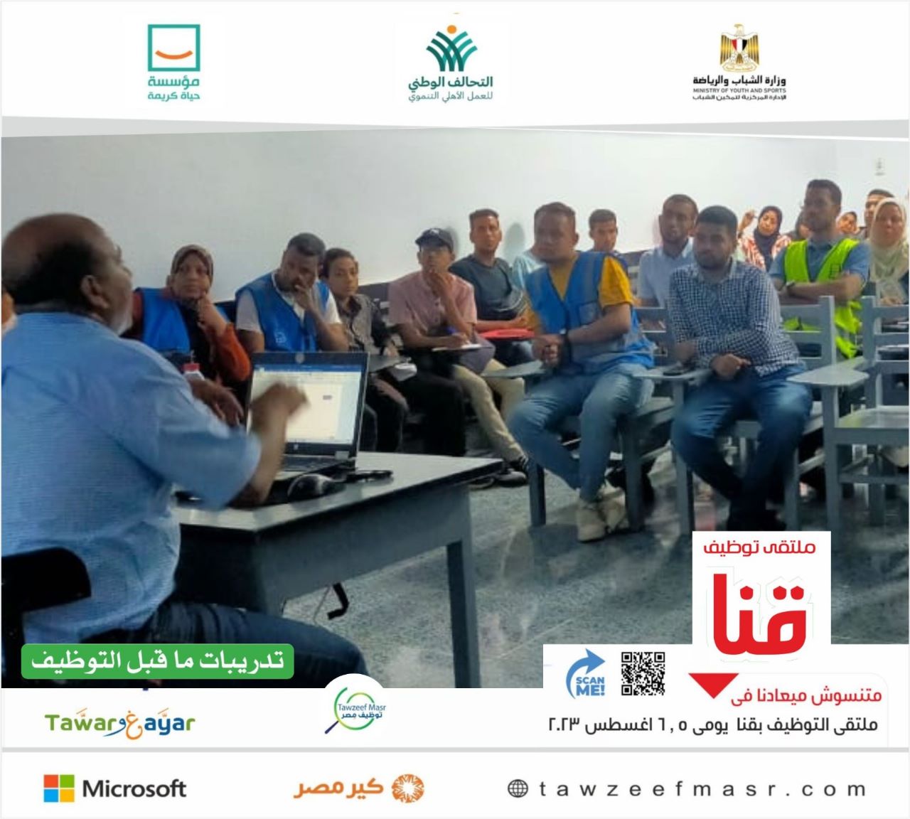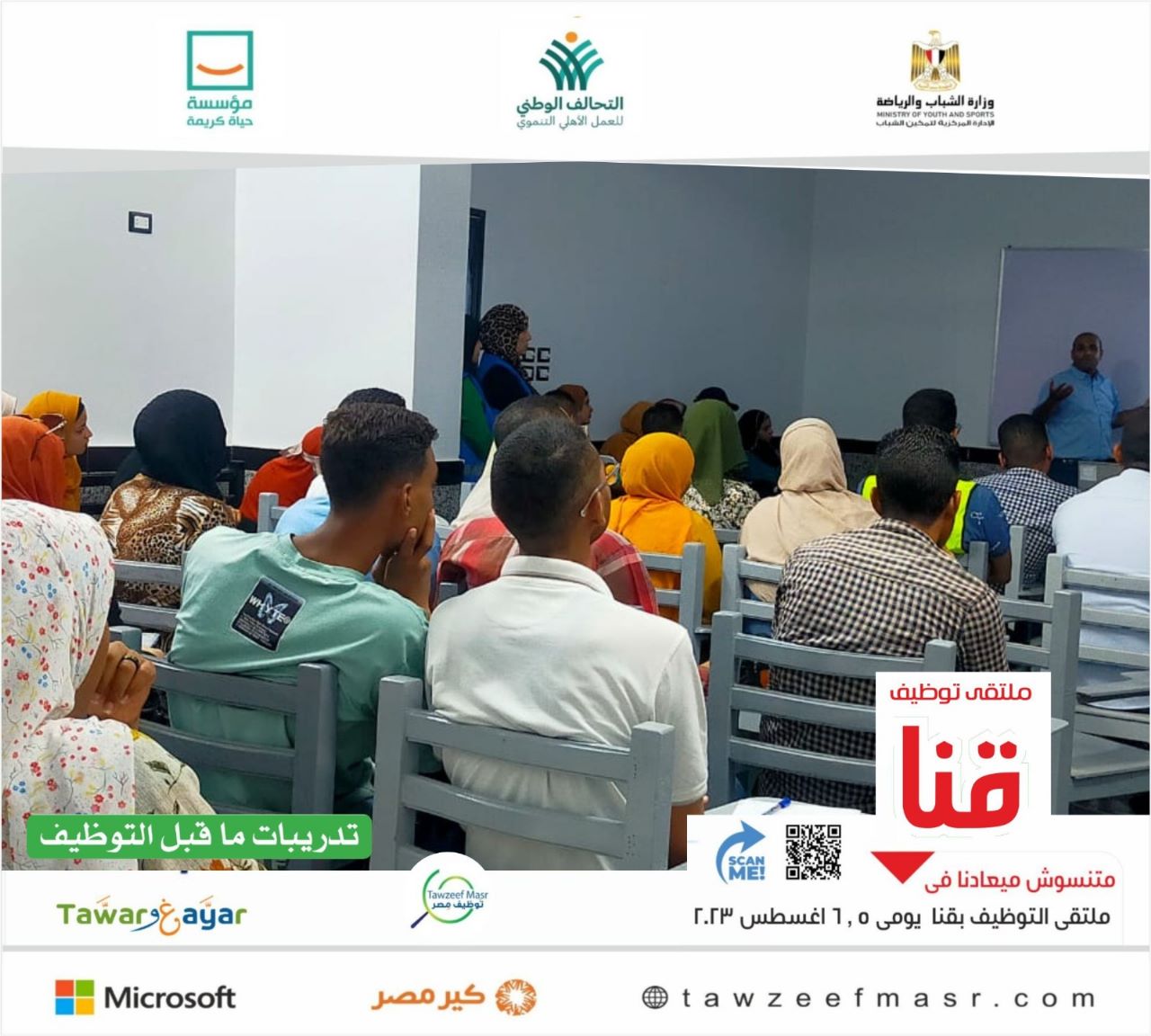 نفذت وزارة الشباب والرياضة من خلال الإدارة المركزية لتمكين الشباب تدريبات "طوَّر وغيَّر" (التدريب من أجل التوظيف)، خلال الفترة من (1- 3) أغسطس، على هامش ملتقيات التوظيف يومي (5، 6) أغسطس الجاري، بمحافظتي الشرقية وقنا، بالتعاون مع مؤسسة حياة كريمة.