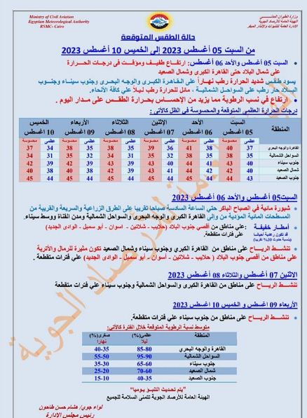 كشفت الهيئة العامة للأرصاد الجوية تفاصيل حالة الطقس من السبت 5 أغسطس 2023 إلى الخميس 10 أغسطس.