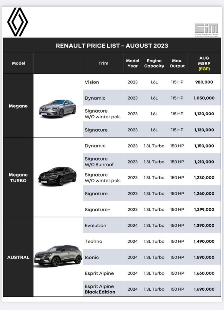 وشهدت القائمة الجديدة الخاصة بسيارات رينو، الصادرة عن الوكيل الرسمي للعلامة، زيادة أسعار رينو ميجان موديل 2023، وميجان تيربو موديل 2023.