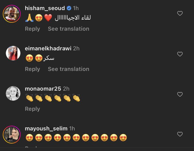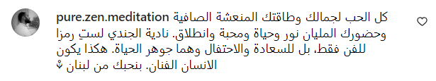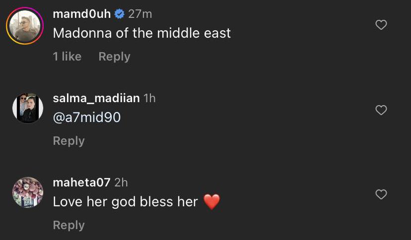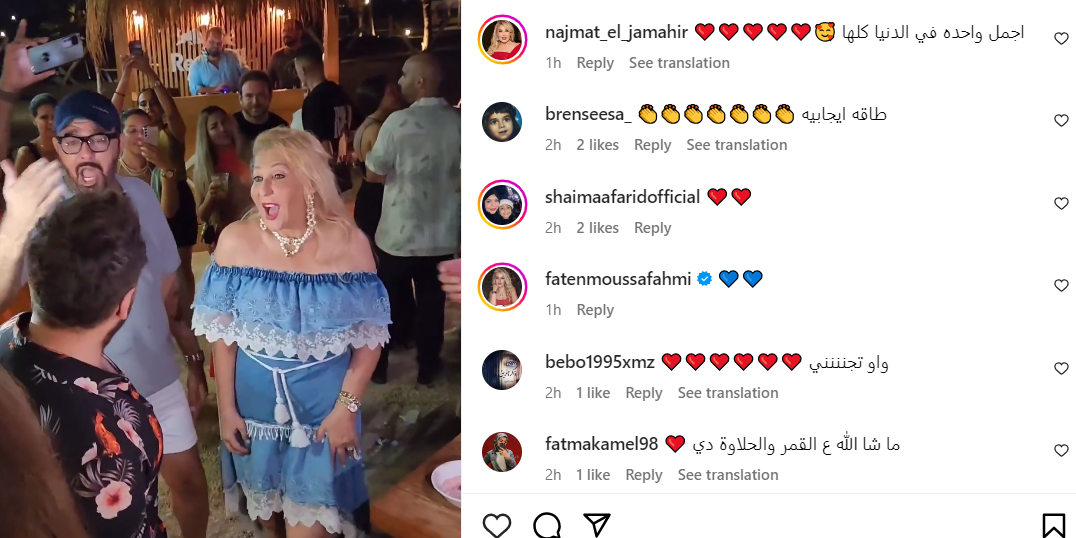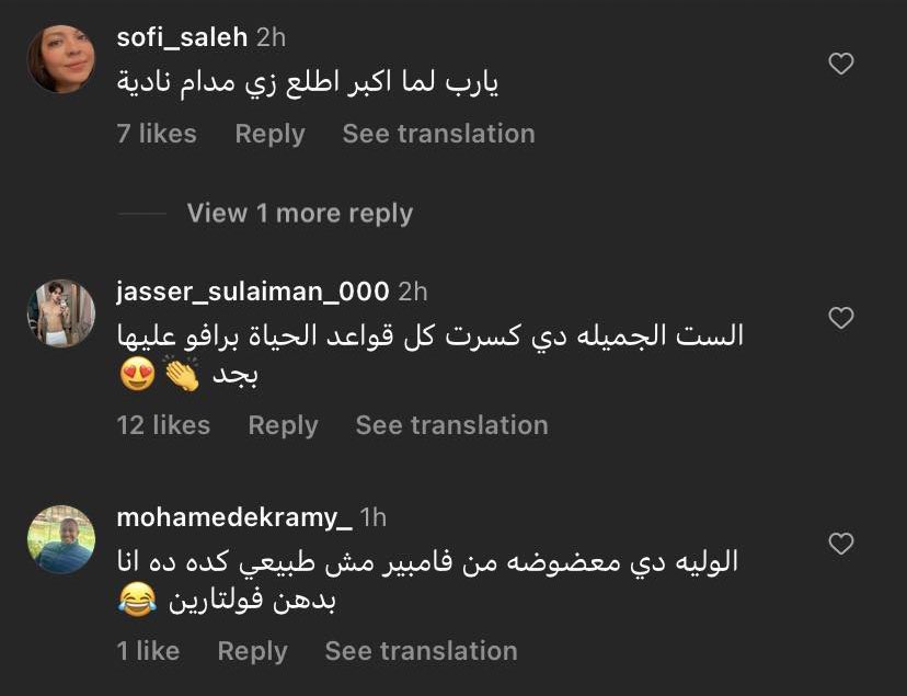 وكانت أبرز التعليقات: "مادونا الشرق الأوسط .. لقاء الأجيال .. الست الجميلة دي كسرت كل قواعد الحياة بجد برافو عليها .. يارب لما اكبر اطلع زي مدام نادية .. معضوضة من فامبير مش طبيعي كده .. سكر .. واو تجنني .. طاقه ايجابيه .. أجمل واحدة في الدنيا كلها .. كل الحب لجمالك وطاقتك المنعشة الصافية وحضورك المليان نور وحياة ومحبة وانطلاق".