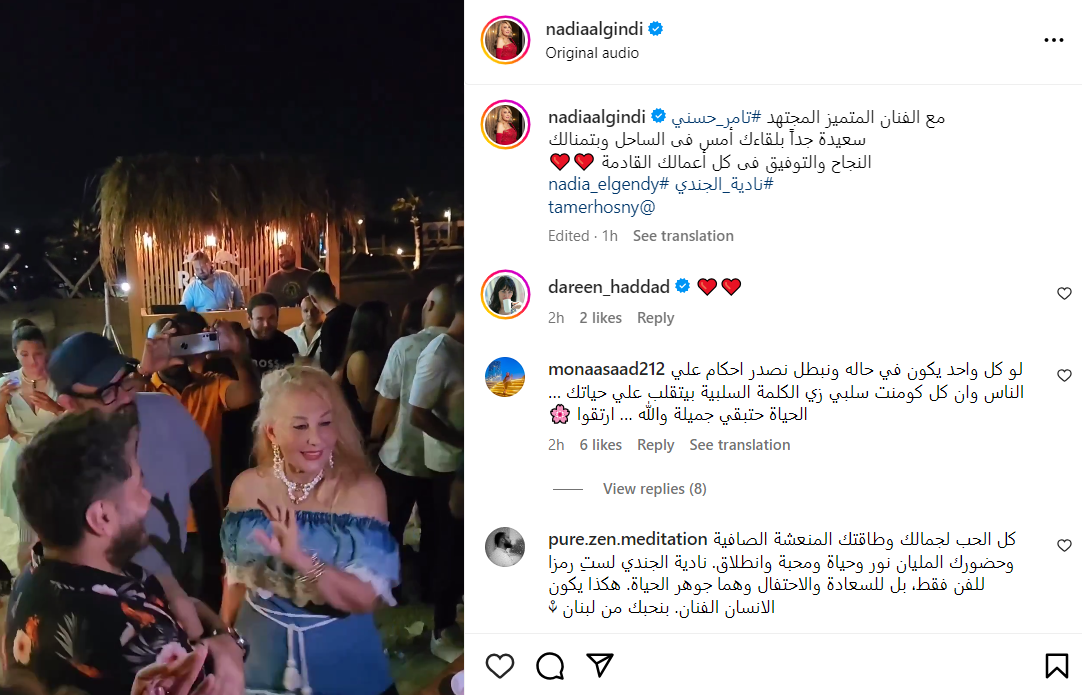 أعربت نجمة الجماهير نادية الجندي عن سعادتها البالغة بمقابلة الفنان تامر حسني خلال سهرة خاصة اجتمعت فيها مع نخبة من النجوم بينهم زينة والمذيعة أسما إبراهيم، وذلك أثناء تواجدها بمدينة الساحل الشمالي للإستمتاع بالإجازة الصيفية، وشاركت الجمهور بمقطع فيديو وهي ترقص وتغني معه بعفوية وروح الشباب تملؤها، على أنغام أغنيته "يا بنت الإيه"، وسط تفاعل كبير من الحضور الذين شاركوهم بالرقص والغناء أيضًا.