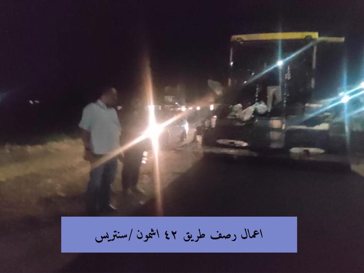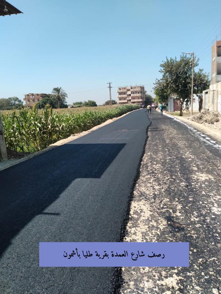 تابع رئيس الوحدة المحلية لمركز ومدينة أشمون أعمال وضع طبقة الربط بطريق 42 أشمون / سنتريس بطول 5 كم كونه طريق حيوى وهام، بالإضافة إلى متابعة أعمال وضع طبقة الرصف بشارع العمدة بقرية طليا بطول 1400م، و كشط طبقة الرصف القديمة بشارع بور سعيد بمدينة أشمون بداية من كوبري القنطرة وحتى مزلقان السكة الحديد تمهيداً لأعمال الرصف تنفيذ الهيئة العامة للطرق والكباري.