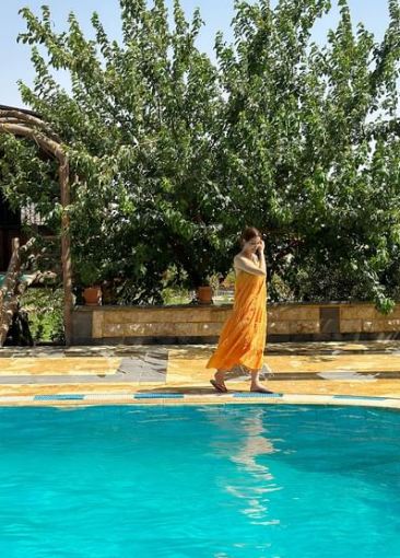 أطلت نسرين طافش بإطلالة جريئة ولافتة وهي تستمتع بوقتها باللعب أمام حمام السباحة، حيث كانت ترتدي فستانًا صيفيًا مثيرًا باللون البرتقالي، قصيرًا ومكشوف الأكمام، بينما اختارت أن تقف حافية القدمين تناغمًا مع إطلالتها العفوية.