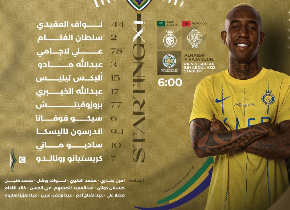 وجاء كريستيانو رونالدو على رأس تشكيل النصر لمواجهة الرجاء اليوم، ومعه أندرسون تاليكا وساديو ماني في المثلث الهحومي، مع وجود سيكو فوفانا ومارسيل بروزوفيتش في وسط الملعب.