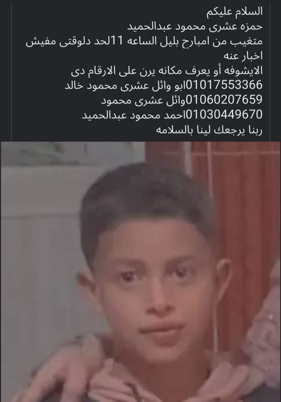 تغيب الطفل حمزة عشري محمود "11" سنة مساء أول أمس الجمعة، ولم يعود إلى منزله بعدما كان يلعب مع الأطفال في شوارع القرية.