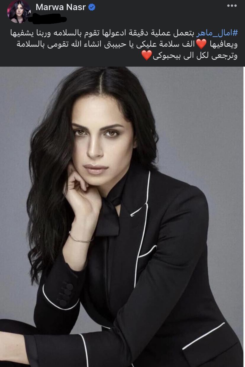 أعلنت مروة نصر عن الخبر خلال منشور عبر حسابها الشخصي بموقع التواصل الإجتماعي الأشهر "فيس بوك" قائلة: "آمال ماهر بتعمل عملية جراحية.. ادعوا لها تقوم بالسلامة وربنا يشفيها ويعافيها"، مضيفة: "ألف سلامة عليكى يا حبيبتى .. إن شاء الله تقومي بالسلامة وترجعي لكل اللي بيحبوكي".