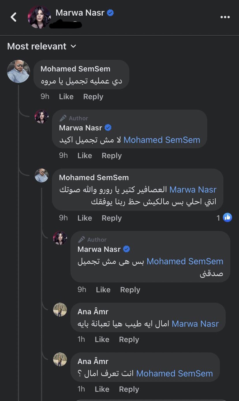 وانهالت تعليقات الجمهور على منشور مروة نصر بالدعاء لآمال ماهر بالشفاء العاجل، فكانت أبرزها: "الف سلامة عاليكى يا صوت مصر الحقيقى ربنا يشفيكى ويعافيكى .. الف سلامة عليكي يا امال صوت مصر الاجمل .. ربنا يشفيكي بنحبك".