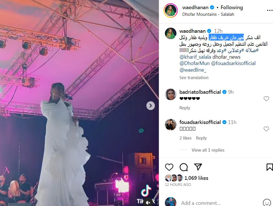وعلقت على الفيديو قائلة: "الف شكر لمهرجان خريف ظفار وبلديه ظفار ولكل القائمين علي التنظيم الجميل وحفل روعه وجمهور بطل وفرقه تهبل شكرا".