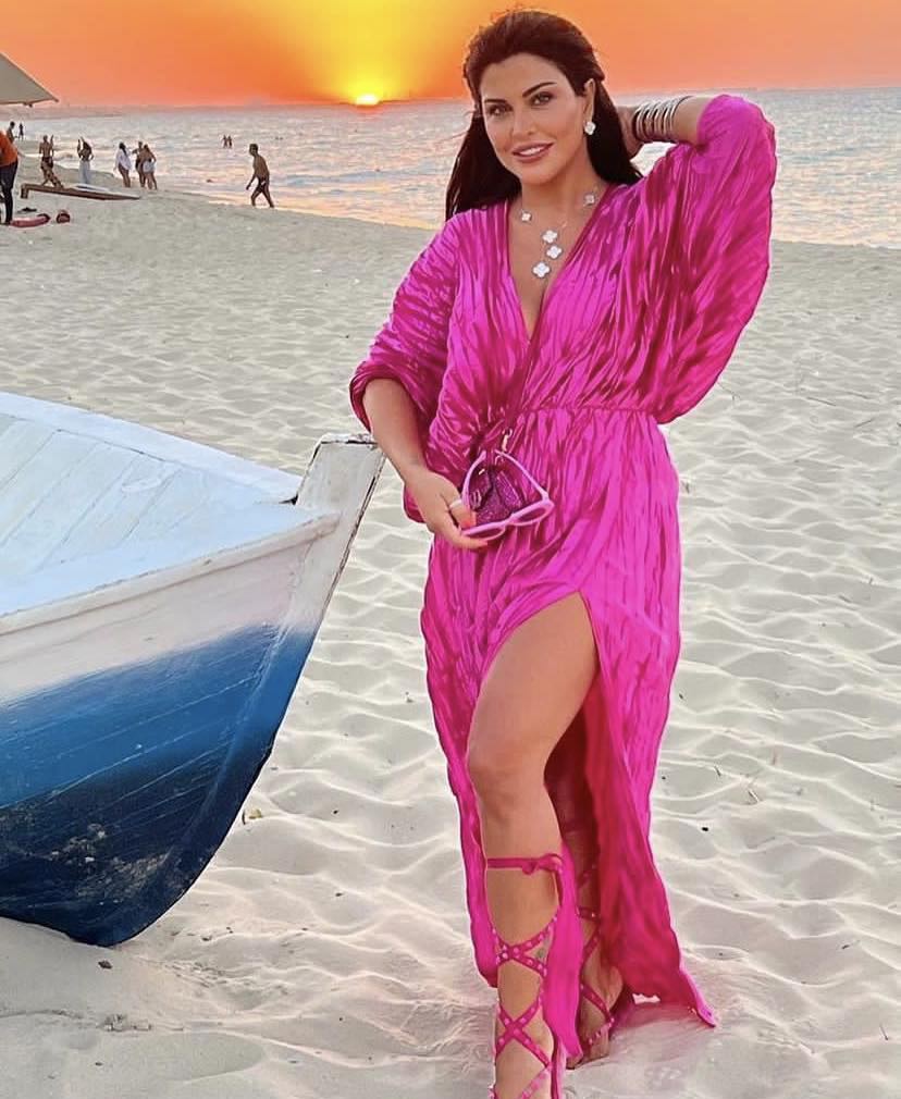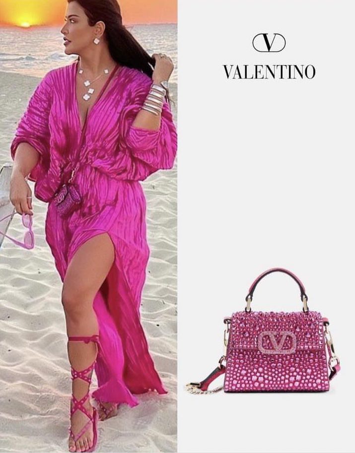 تألقت جومانا مراد بإطلالة مثيرة ولافتة للأمظار، إذ ارتدت فستانًا صيفيًا جريء باللون الفوشيا بتوقيع L’IDÉE، ويبلغ سعره 14 ألف جنيه، مكشوف الصدر وذا أكمام فضفاضة، تميزه فتحة جانبية جريئة، كشفت عن ساقيها بالكامل، فيما انتعلت عليه حذاء أنيق بأشرطة طويلة باللون الفوشيا أيضًا، كما حملت حقيبة صغيرة الحجم بتوقيع "فلانتينو"، وارتدت نظارة شمسية بنفس اللون، على طريقة أزياء "باربي"، مما أبرز أنوثتها الطاغية وقوامها الرشيق الممشوق.