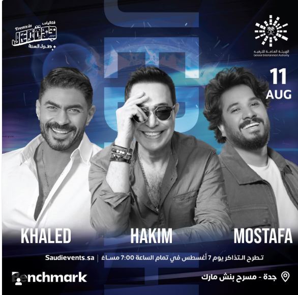 يلتقي رواد فعاليات جدة للمرة الأولى الفنان الشعبي الكبير حكيم والفنان خالد سليم، بجانب الفنان مصطفى حجاج، وذلك في الـ11 من أغسطس الجاري على مسرح بنش مارك بطريق الملك عبدالعزيز بمدينة جدة.