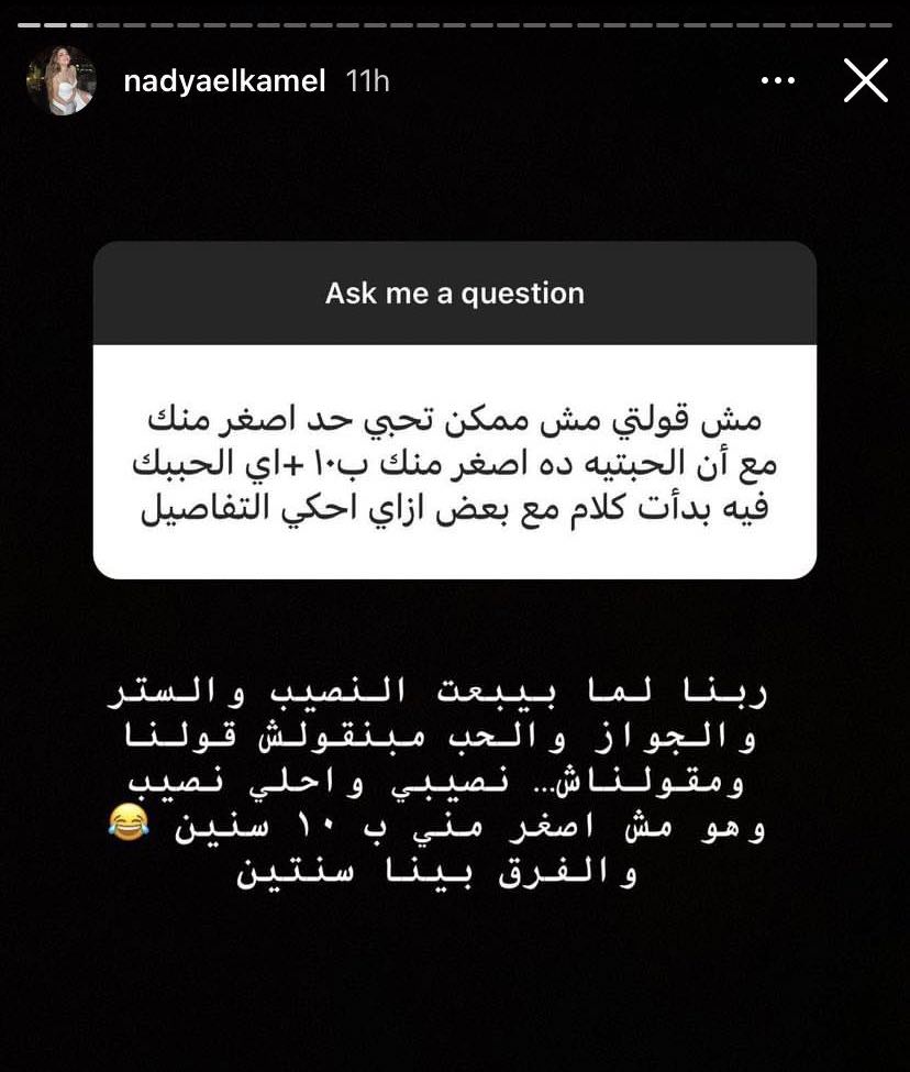وفي سياق متصل، فاجأت ندى الكامل متابعيها أن زوجها يصغرها سنًا، على الرغم من قرارها بأنها لن تتزوج برجل يصغرها في السن مطلقًا، وجا ذلك خلال ردها على سؤال أحد المتابعين: "مش قلتي مش ممكن تحبي حد أصغر منك مع إن اللي حبتيه ده اصغر منك بـ 10 سنين .. ايه اللي حببك فيه وبدأتوا كلام مع بعض ازاي احكي التفاصيل".