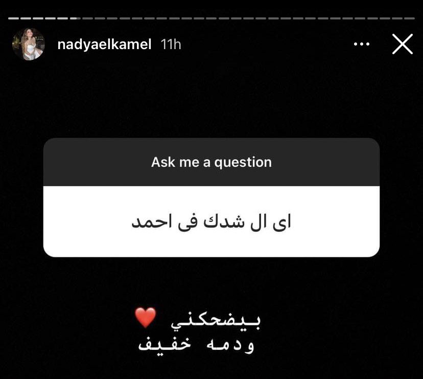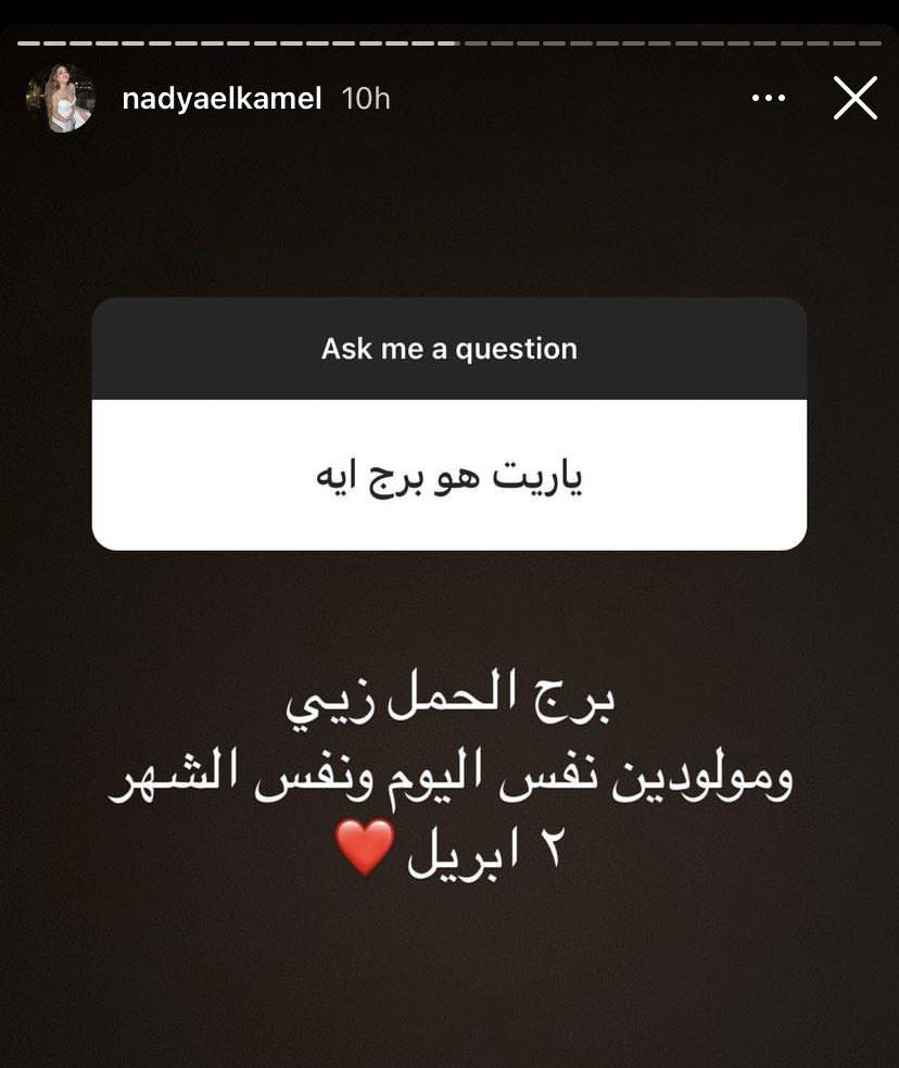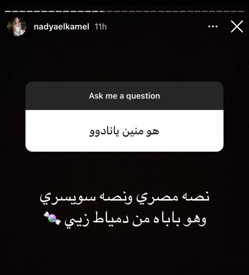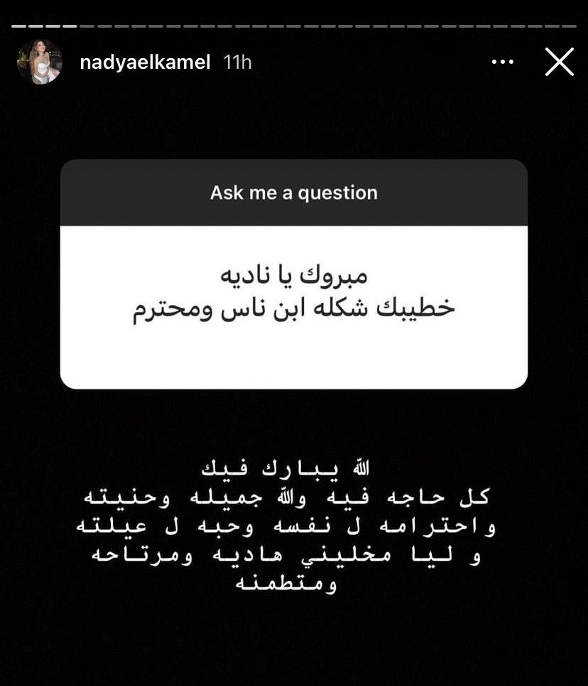 وحرصت طليقة الفيشاوي على إبراز مميزات زوجها الجدي، خلال ردها على سؤال متابع قال: "مبروك يا نادية خطيبك شكله ابن ناس ومحترم"، لتجيب قائلة: "الله يبارك فيك .. والله كل حاجة فيه جميلة وحنيته واحترامه لنفسه وحبه لعيلته وليا مخليني هادية ومرتاحة ومتطمنة"، كما أضافت ردًا على سؤال متابع آخر: "بيضحكني ودمه خفيف وبرج الحمل زيي مولودين في نفس اليوم ونفس الشهر 2 ابريل"، مشيرة إلى أن جنسيته مزيجًا بين مصري وسوري، بينما والده من محافظة دمياط.