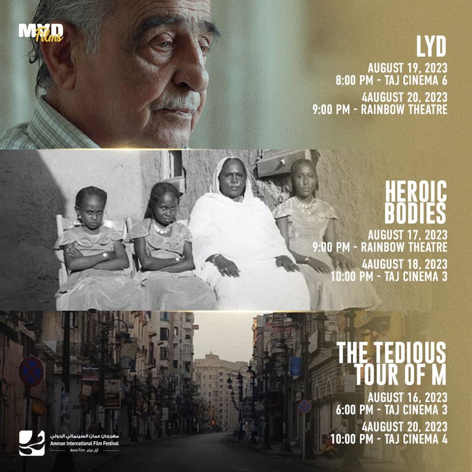 فاز بخمس جوائز دولية ومن بينها جائزة لجنة تحكيم EcoProd من مهرجان كان السينمائي الدولي، جائزة التانيت الفضي من أيام قرطاج السينمائية، جائزة البايارد الذهبي من مهرجان نامور السينمائي ميعاد العرض: الجمعة 18 أغسطس الساعة 8 مساءً - تاج سينما 6 الثلاثاء 22 أغسطس الساعة 5:30 مساءً - مسرح الرينبو اللِد | رامي يونس وسارة إِما فريدلاند | فلسطين - الولايات المتحدة - المملكة المتحدة |أداء صوتي لمدينة اللِد: ميساء عبد الهادي ميعاد العرض: السبت 19 أغسطس الساعة 8 مساءً - تاج سينما 6 - مناقشة مع ثنائي الإخراج الأحد 20 أغسطس الساعة 9 مساءً - مسرح الرينبو - مناقشة مع ثنائي الإخراج جولة ميم المملة | هند بكر| مصر| محمد حافظ رجب - شهد عرضه العالمي الأول في مهرجان أسوان الدولي لأفلام المرأة - نال تنويه خاص من لجنة تحكيم مهرجان قابس سينما فن ميعاد العرض: الأربعاء 16 أغسطس الساعة 6 مساءً - تاج سينما 3 - يتبعه مناقشة مع المخرجة الأحد 20 أغسطس الساعة 10 مساءً - تاج سينما 4 - يتبعه مناقشة مع المخرجة أجساد بطولية | سارة سليمان |السودان | آية طارق - ياسين رئيف - أحمد رئيف - حصل على عرضه العالمي الأول في مهرجان أمستردام الدولي للأفلام الوثائقية - فاز بجائزة الجمهور في مهرجان مالمو للسينما العربية في السويد ميعاد العرض: الخميس 17 أغسطس الساعة 9 مساءً - مسرح الرينبو - مناقشة مع المخرجة الجمعة 18 أغسطس الساعة 10 مساءً - تاج سينما 3 - مناقشة مع المخرجة عَبْد | عبد السلام الحاج | الأردن | هشام العماري - محمد أبو أجوله - علي بدرانة .
