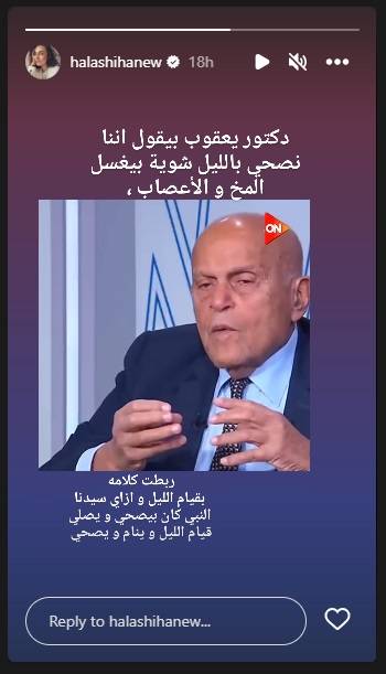 نشرت حلا شيحة عبر خاصية القصص المصوّرة الملحقة بحسابها الشخصي في "إنستجرام"، يتضمن مقطع فيديو من لقاء تلفزيوني للدكتور مجدي يعقوب، يتحدث فيه عن فائدة الاستيقاظ من النوم في الليل للجسم والمخ، لتمزج حلا ذلك في تعليقها قائلة: "بفضل صلاة قيام الليل".