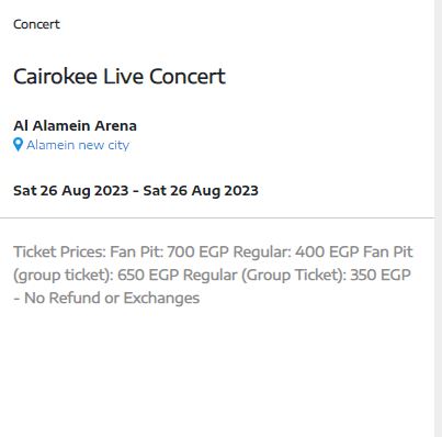 ومن المقرر أن يقام حفل كايروكي في الـ 26 من أغسطس الجاري، وتم طرح التذاكر عبر الموقع الإليكتروني الخاص بها.