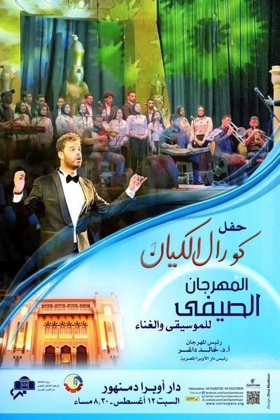 يقدم كورال الكيان بقيادة المايسترو أحمد الريانى، ضمن فعاليات المهرجان الصيفى للموسيقى والغناء الذى تنظمه دار الاوبرا المصرية برئاسة الدكتور خالد داغر بمحافظة البحيرة.