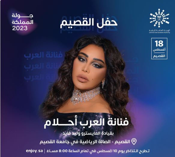 ومن المقرر ان يقام حفل الفنانة أحلام في مدينة القصيم بقيادة المايسترو وليد فايد داخل الصالة الرياضية بجامعة القصيم، على أن يتم طرح التذاكر الليلة عبر الموقع الغليكتروني الخاص بها.