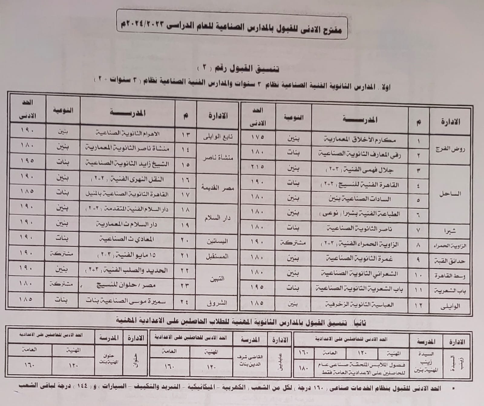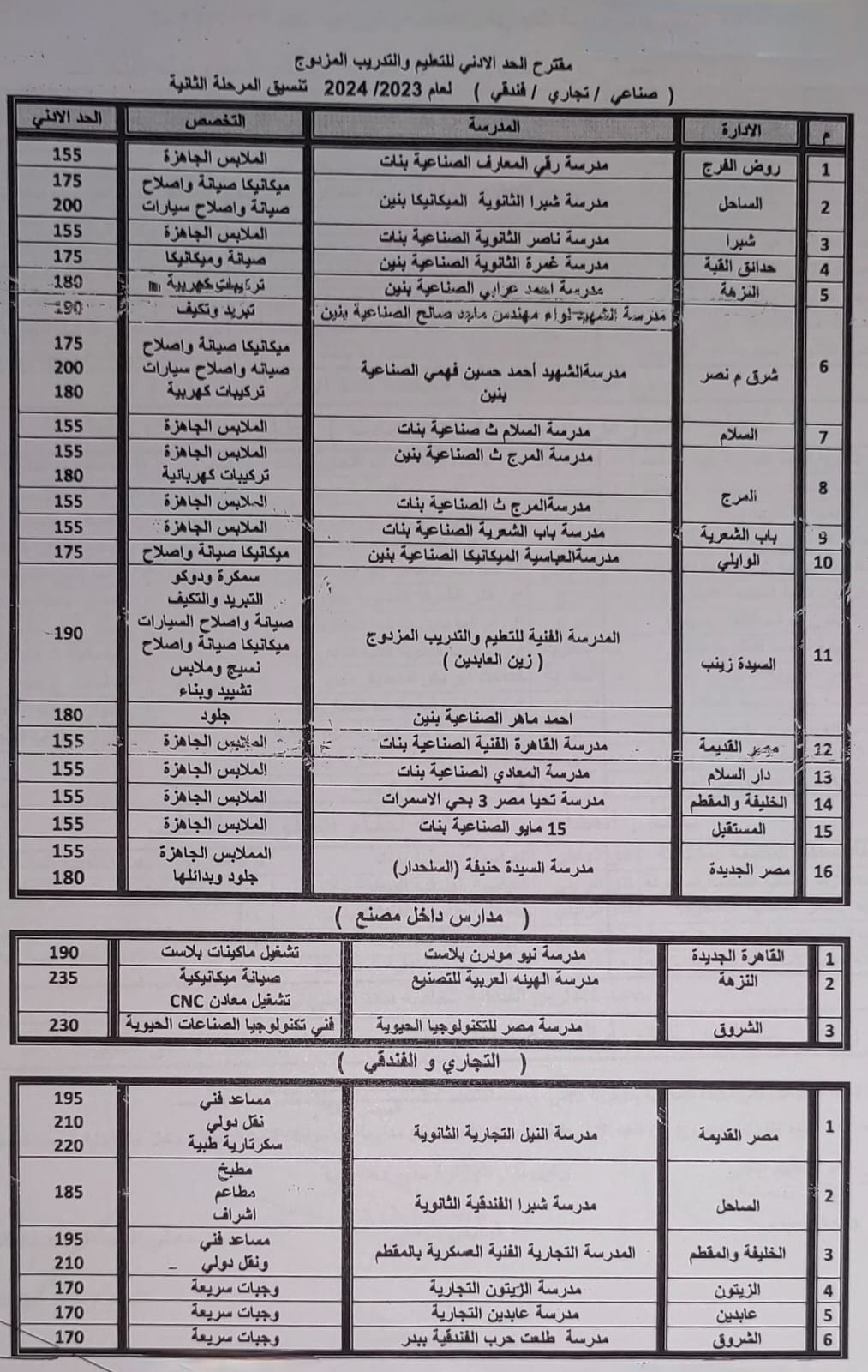 قرر اللواء خالد عبدالعال، محافظ القاهرة، النزول بدرجة الحد الأدنى لتنسيق القبول بمدارس التعليم الفنى (صناعى، تجارى، فندقى، زراعى) للعام الدراسى ٢٠٢٣ / ٢٠٢٤