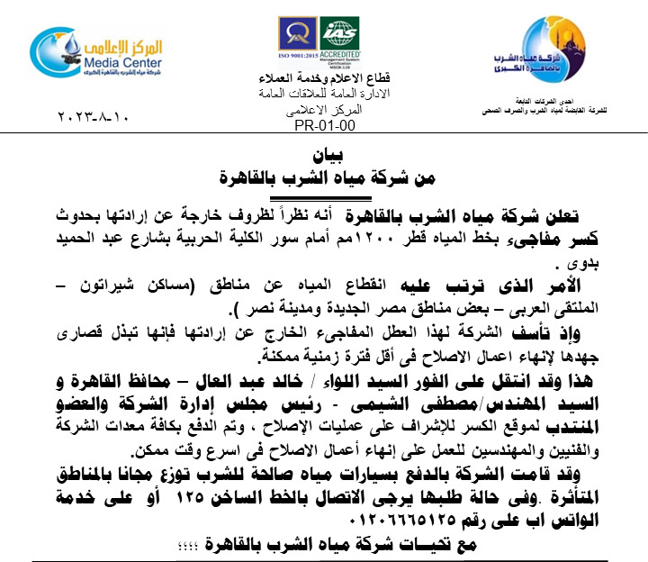 أعلنت شركة مياه الشرب بالقاهرة، أنه نظرًا لظروف خارجة عن إرادتها بحدوث كسر مفاجىء بخط المياه قطر 1200مم أمام سور الكلية الحربية بشارع عبدالحميد بدوى الأمر الذى ترتب عليه انقطاع المياه عن مناطق (مساكن شيراتون – الملتقى العربى – بعض مناطق مصر الجديدة ومدينة نصر ).