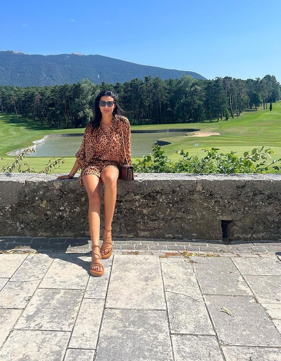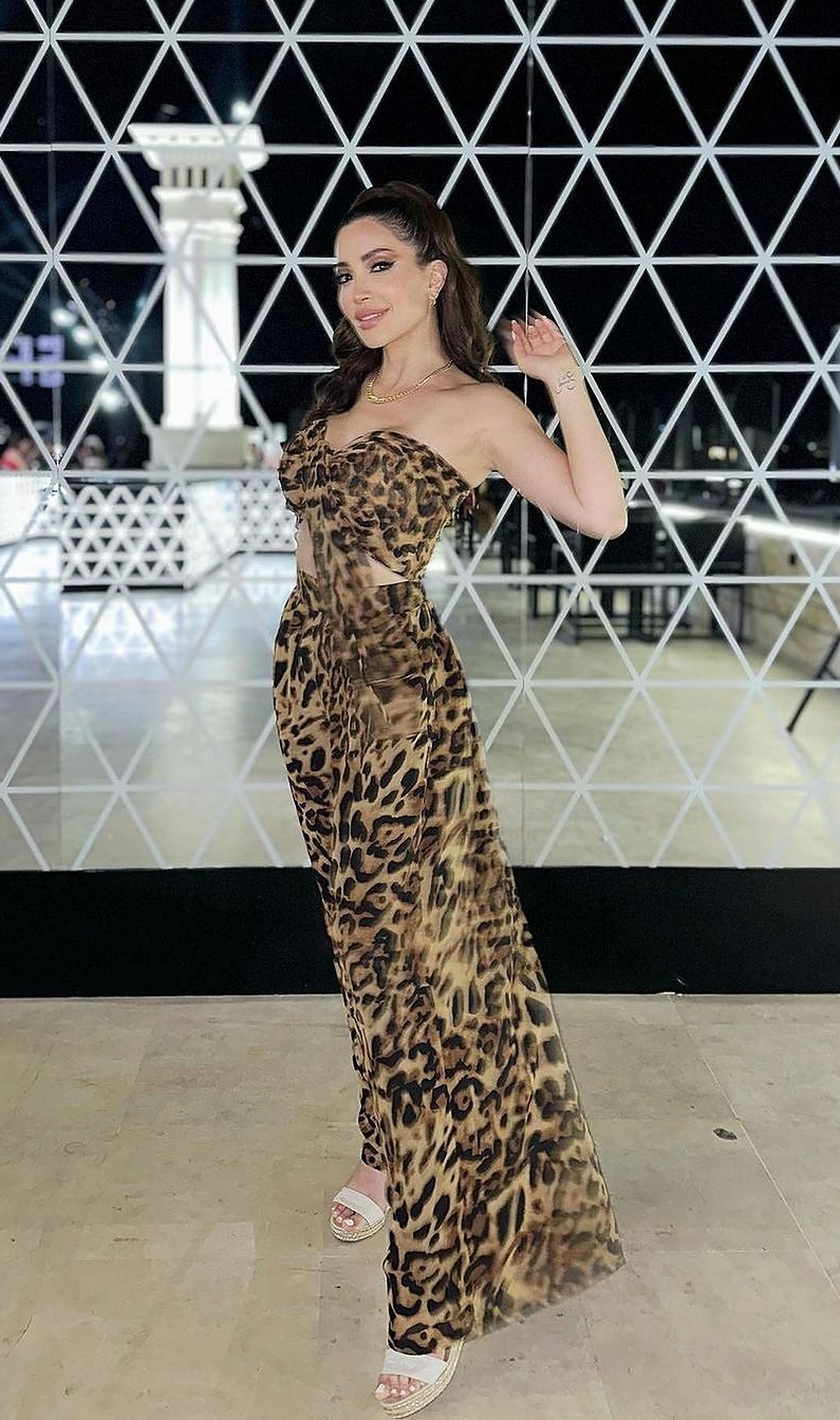 تألقت النجمة نسرين طافش بتقشة التايجر الشقية، بقصة الجمبسوت المكشوف من الجانبين، صمم من قماش ناعم، لتتناغم مع أجواء المصيف ونسقت عليها صندلًا بكعب عال.