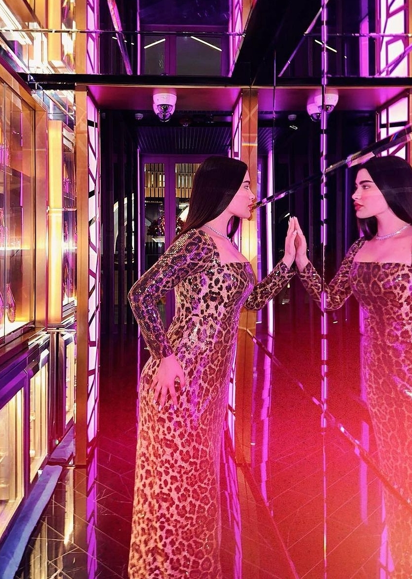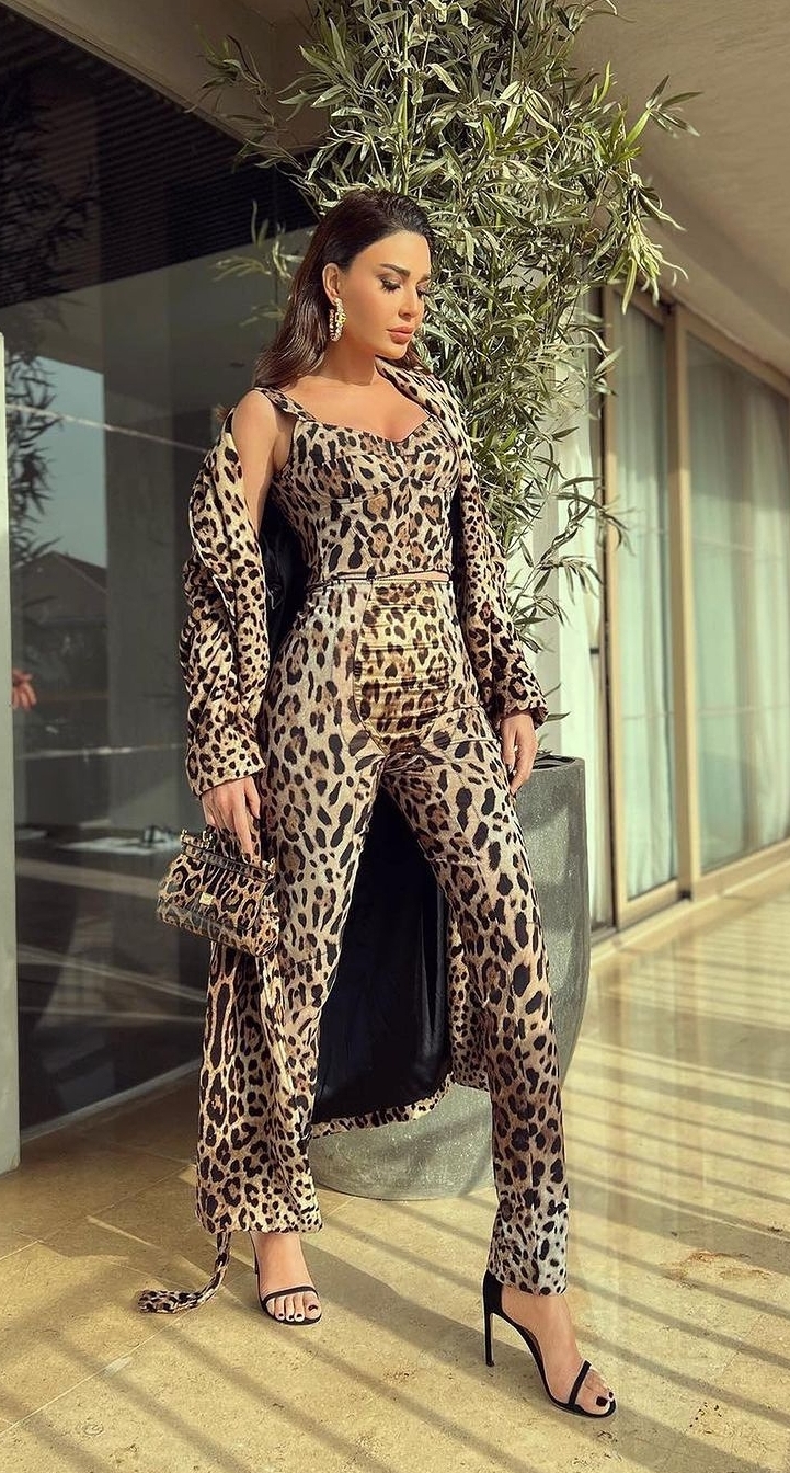 بدت النجمة سيرين عبدالنور بإطلالة أنوثية الساحرة، إذْ ارتدت جمبسوت مجسمًا ينتمي لقصة الكورسية ونسقت عليه بالطو بنقشة التايجر مع حذاء بكعب عال مع حقيبة يد صغيرة غاية في الأناقة، لتعطي نموذجًا مثاليًّا لخروجات المسائية.