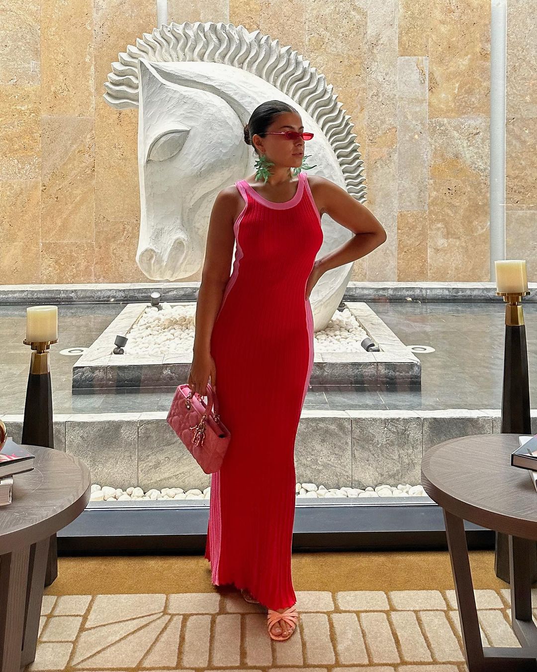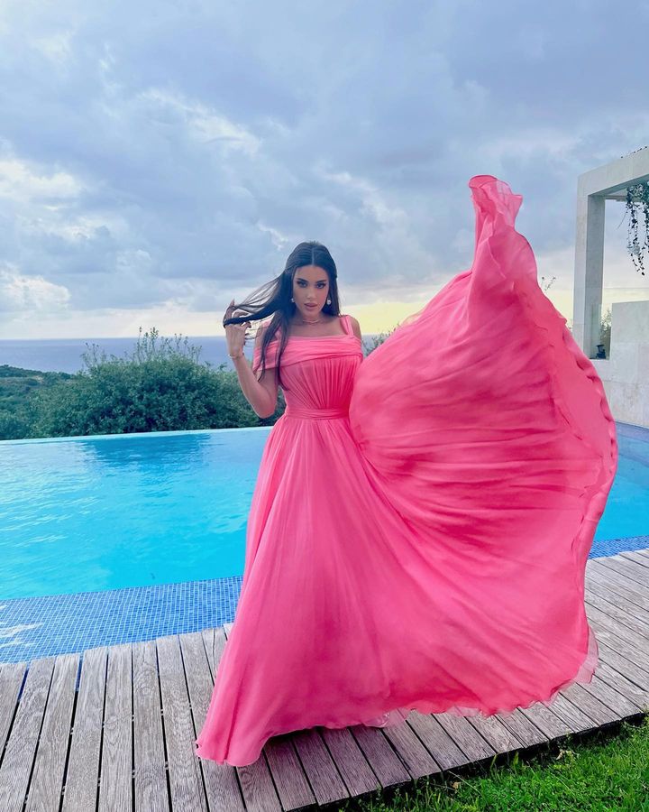 مينا الشيخلى الإعلامية العراقية تألقت بفستان طويل مجسم وحقيبة وصندل مسطح باللون الوردي الغامق.