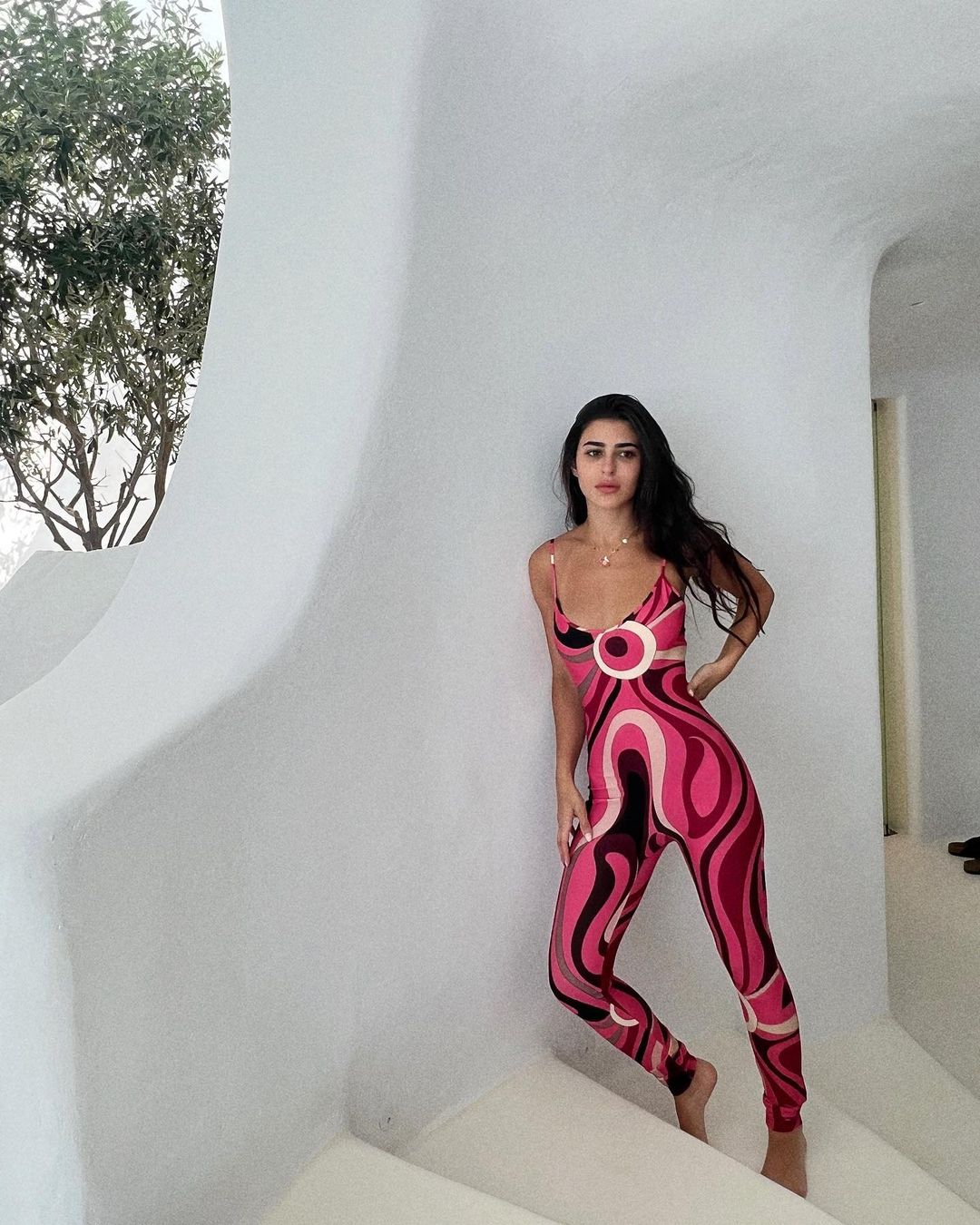 أما ديما الشيخلي خبيرة الموضة العراقية تألقت بجمبسوت صيفي ضيق منقوشًا في جميع أنحائه بالدرجات المختلفة من اللون الوردي.