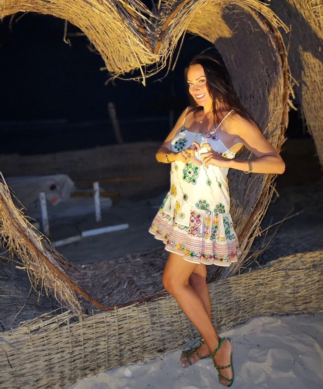وبدت نرمين الفقي بإطلالة صيفية لافتة أثناء استجمامها بالعطلة الصيفية أمام الشاطئ، إذ ارتدت فستانًا قصيرًا فضفاضًا من دون أكمام، صمم من قماش ناعم باللون الأبيض مزركش بالزهور الملونة من الأطراف، الفستان عكس قوامها الممشوق ووزنها المثالي.