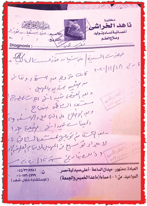 وأكدت «الزوجة» أن أسرتى عندما حضروا إلى منزل الزوجية، أخبرونى بأن ما يدعيه زوجى كان أمراً قديماً، وأننى أجريت لى عملية تكميلية لعلاج عيب خلقى فى الأعضاء التناسلية، وليست تحويل من جنس إلى آخر، وأن الأمر جاء بسبب أن والدى ووالدتى أقارب من الدرجة الأولى، فأقسم «يسرى» بأنه سوف يفضح أسرتى ويأخذ منهم ما يمتلكون، وتعرضت لكل أشكال السب والإهانة فترة طويلة، لحين عرضى على استاذة دكتورة كبيرة استشارى نساء وولادة، وبعد توقيع الكشف على طلبت منى إجراء جراحة تكميلية، وبالفعل تمت هذه الجراحة، وجاء تقرير من الطبيبة ناهد الخراشى استشارى النساء، التى تتابع حالتى، «مستند 4»، ونصه كالتالى: «حضرت السيدة منى. ش بتاريخ 18 نوفمبر 2020، وهى متزوجة من 3 شهور، وتعانى من ضيق فى المهبل، وبعد الفحص تبين أنها أجرت عملية جراحية بمستشفى الشاطبى بنجاح، وبعد الاطلاع على التحاليل والأشعة وتحليل الجينات، تبين أنها طبيعية جداً، وبعد الكشف تم تحويلها لمستشفى الشاطبى ثانية لإجراء توسيع فى المهبل لإتمام العلاقة الزوجية وذلك بتاريخ ديسمبر 2020، وحضرت فى 26 ديسمبر 2020، وبعد الكشف الطبى تبين أن العملية ناجحة والأمور على ما يرام، وبتاريخ 6 يناير 2021 تم عمل تحاليل ثانية وتبين أنها سليمة ولا يوجد موانع للإنجاب، وتم صرف منشطات لتسهيل الإنجاب، وحضرت بتاريخ 7 مارس 2021، وتبين أنها حامل فى بداية الحمل، وبتاريخ 14 مارس تم الكشف لمتابعة الحمل، وفى 24 مارس حدث إجهاض وتم عمل أشعة وصرف العلاج».